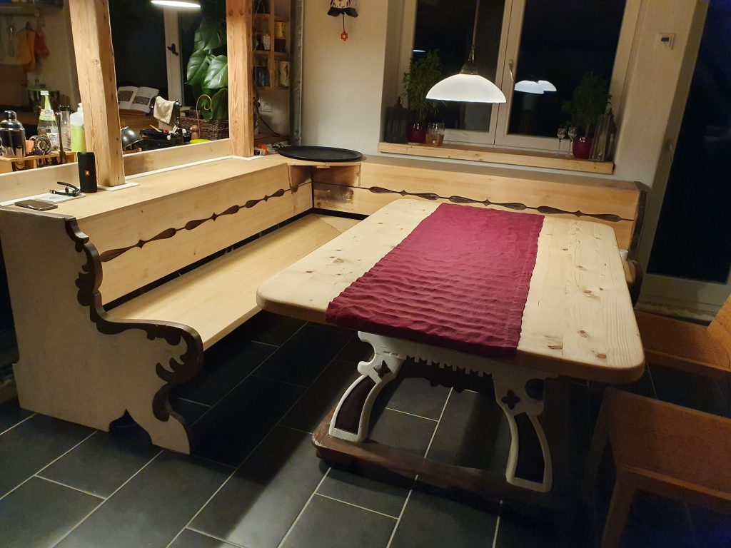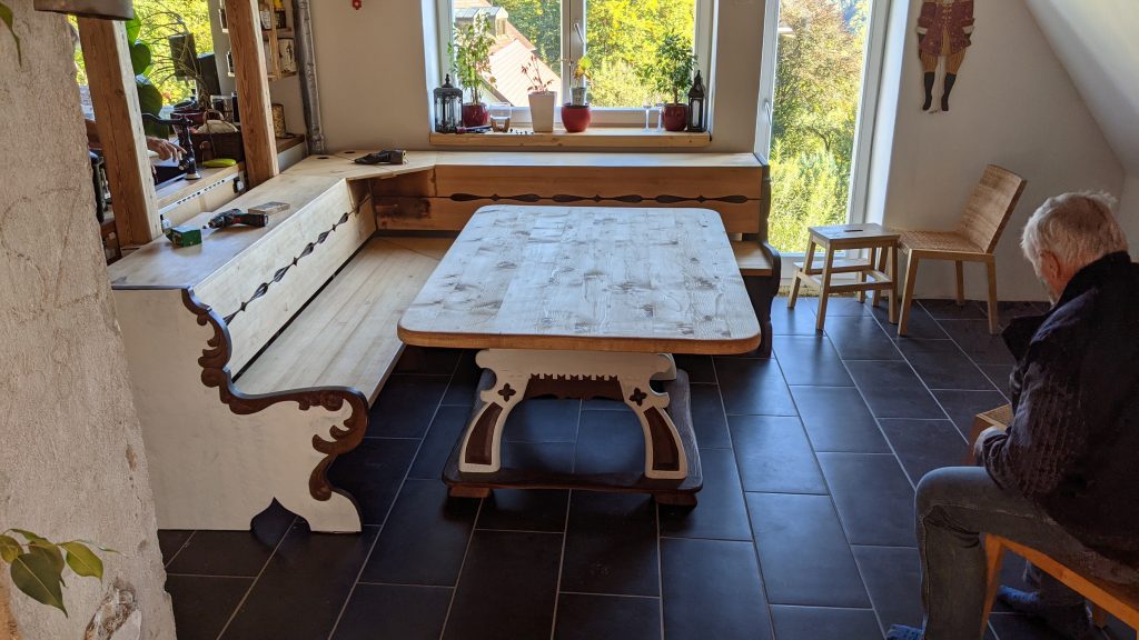 Für fortgeschrittene Upcycler geht aber noch mehr. Chris hat eine Bank im Netz gefunden. Ganz in der Nähe. Eigentlich in U-Form und damit riesig. Und ziemlich dunkel gebeizt. Aber dafür Vollholz und für nur 350Euro. Wer uns kennt, weiss, wir schrecken vor nix zurück, wenn wir mal einen Vision haben. Auch wenn sie Arbeit bedeutet! Und so haben Alex und Chris die Monsterbank für unser Monster abgeholt. Witzige Geschichte dahinter: die Bank gehörte zwei verrückten Menschen, die sich auf dem Land ein Grundstück mit einem sanierungsbedürftigen alten Haus gekauft und alles selbst gemacht haben! Solche Spinner! Würde ich ja niee machen!
