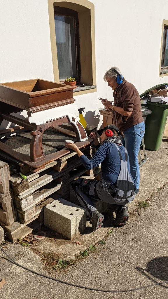 Teil 3: dann wurde gemahlt. Um die Schnitzereien an den Fronten hervorzuheben und den Stil ein wenig zu modernisieren hat Chris kalkbesierte Farbe mit „Vintagecharakter“ geholt. Ich bin begeistert!