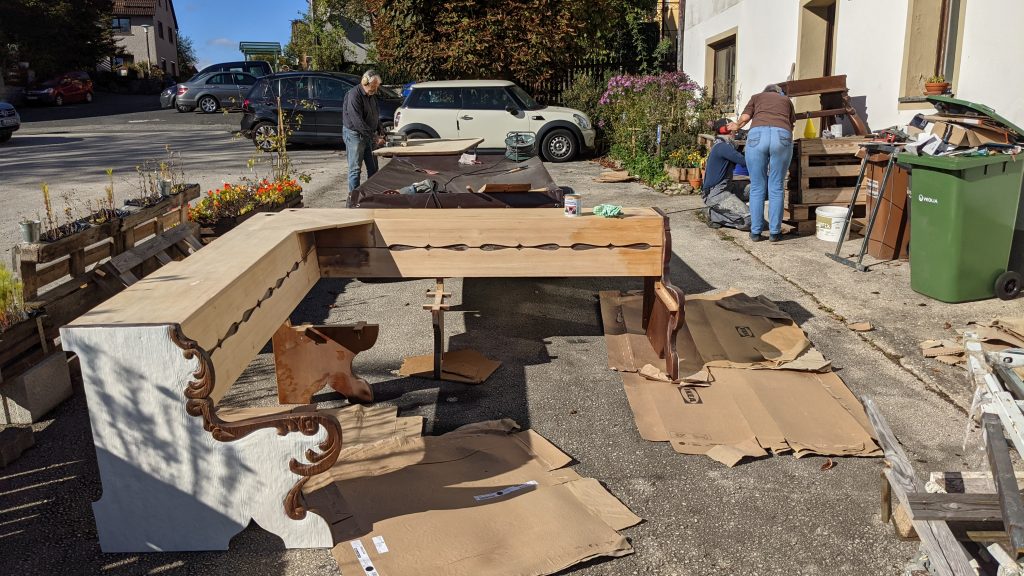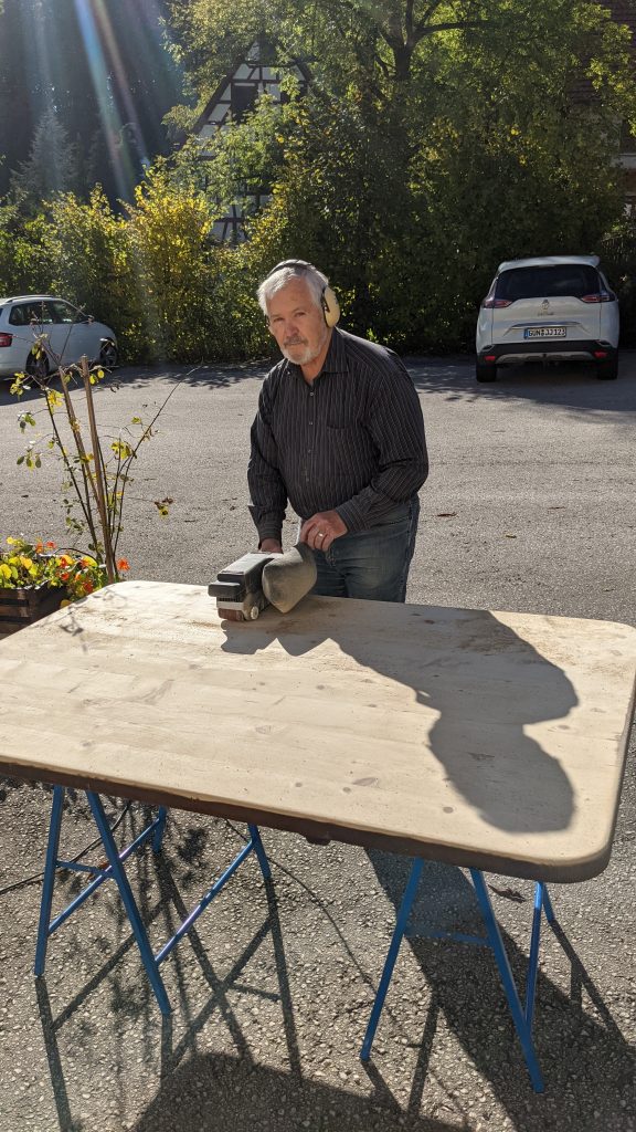 Der Plan war dann: Teil 1: wir nehmen das Mittelteil und das U wird zu einem L werden und haben wir die Einzelteile in die Sonne geschleppt. Teil 2: wir schleifen die Sitzflächen ab, die Tischplatte auch. Also: Bine und ihre fleissigen unermüdlichen Minions – nennen wir sie Eltern – haben wie die Weltmeister geschuffelt!