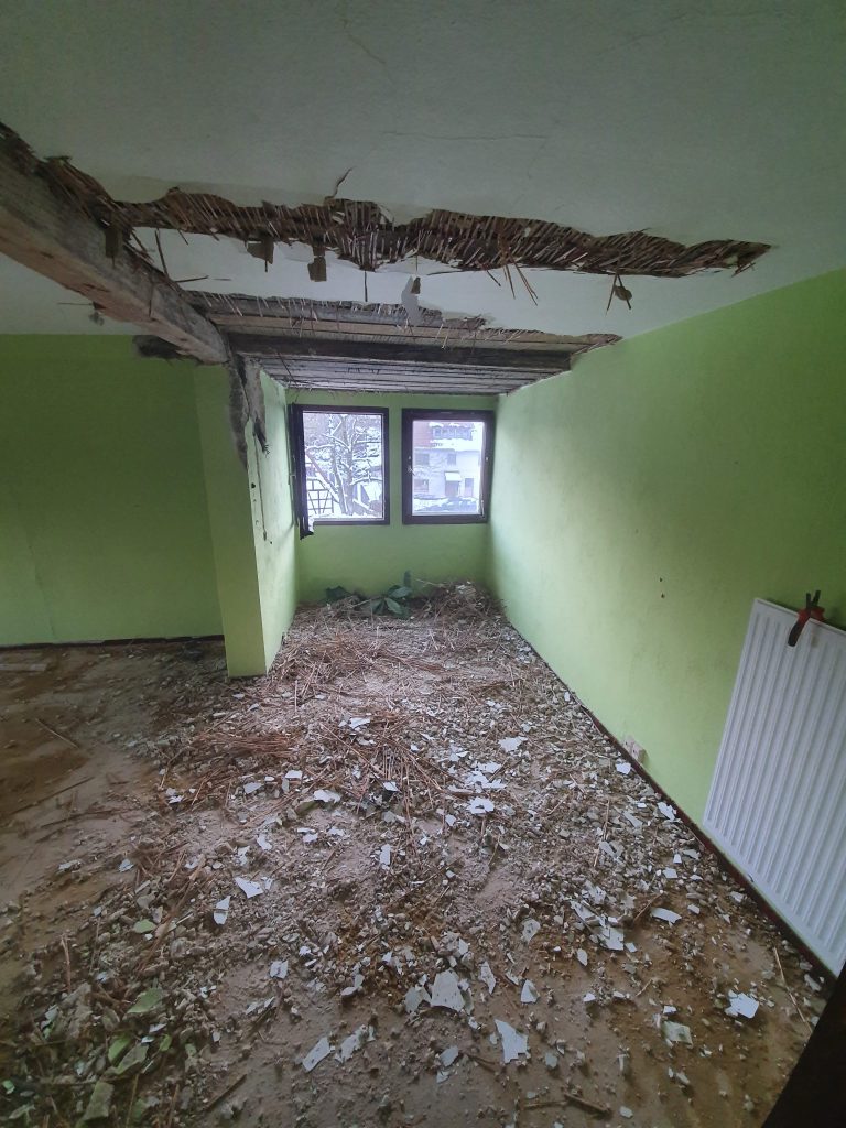 Wir wollten mal schauen, was sich so unter den Lagen von Geschichten und Geschichte verbirgt und was uns die nächsten Monate eventuell noch so beschäftigen wird. Was sind dass für Böden und Wände? Sind unter den Verschalungen Balken oder nicht? Ist das Schimmel oder Farbe? Viele Fragen die wichtig sind für alles was noch kommt.