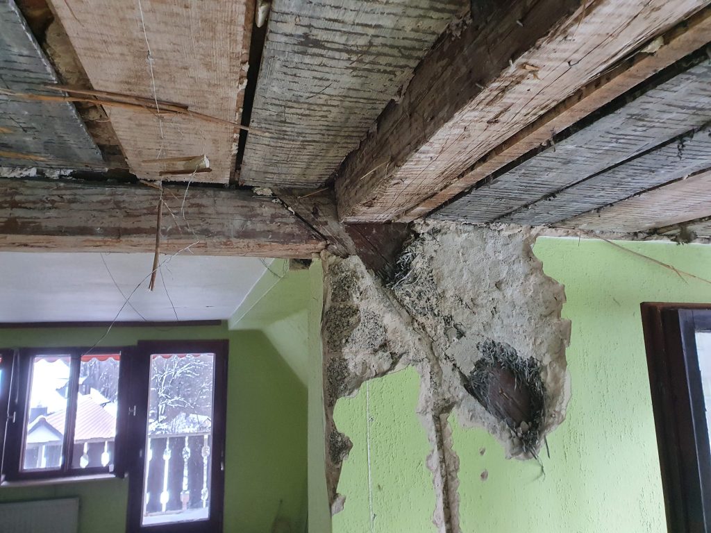 Als wir uns das Haus angeschaut haben war schon von vorne herein klar, daß sich unter dem alten Putz Dinge verstecken, die wir wieder zum Vorschein holen möchten. Und so war es auch. Nach nur ein wenig Gewalt und fliegenden Hammerköpfen hatten wir die ersten Holzschätze frei gelegt.