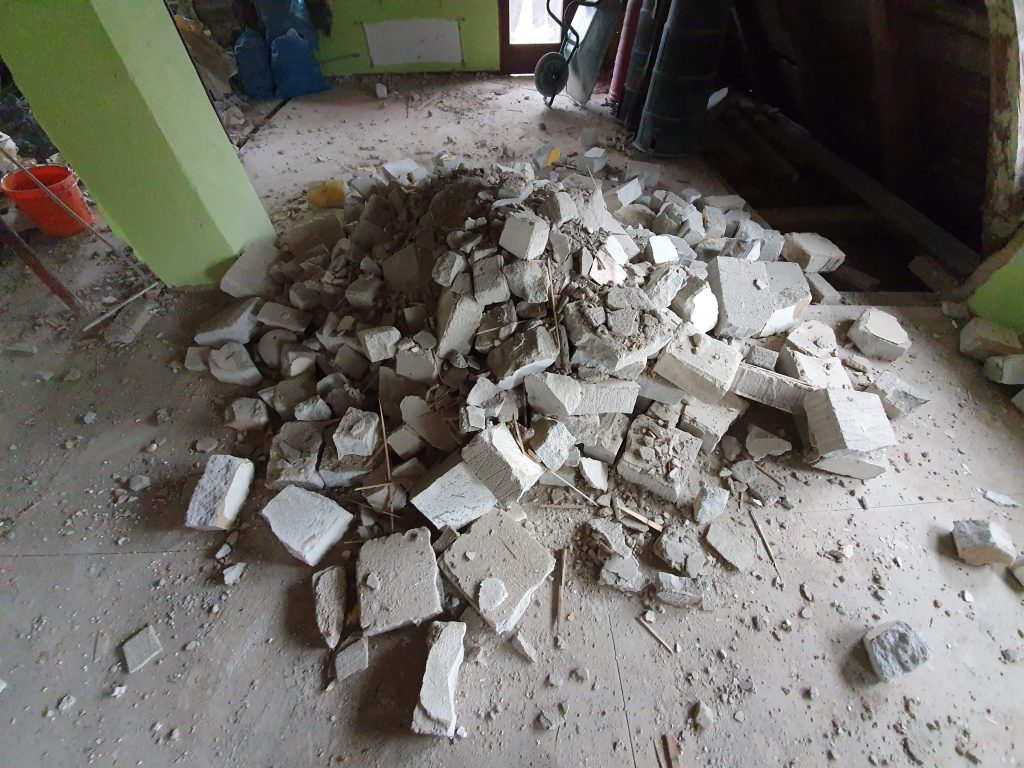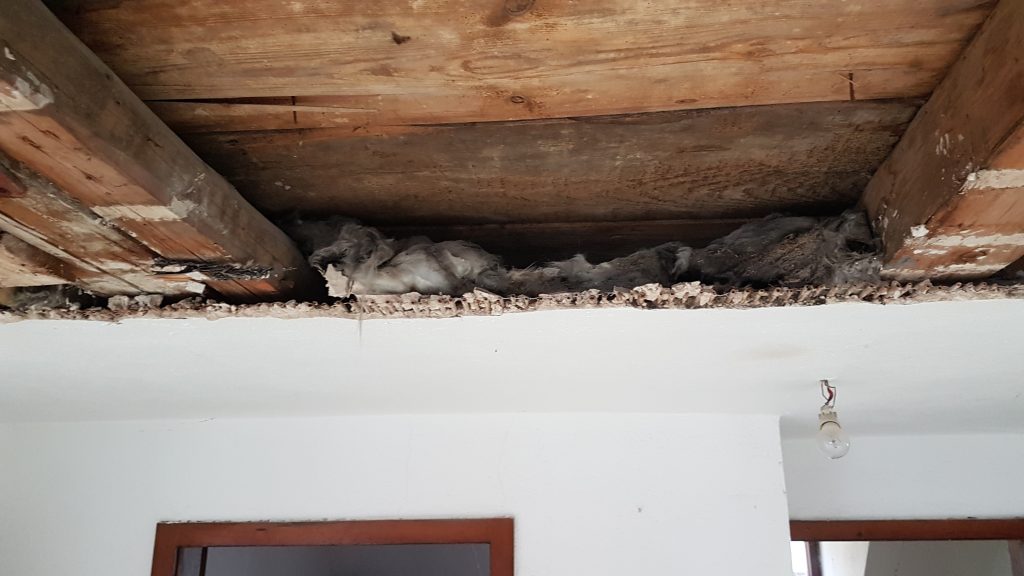 Auch auf der Abschußliste: die Bastmatte. Ein bisschen schade, ist sie doch ein guter Putzträger für die Decken. Da wir diese aber komplett neu machen, muss der Bast weichen. Nicht immer lustig, denn die Matte ist mit Draht an der Decke fixiert. Der ist später in dem ganzen Schutt eine tolle Stolperfalle!