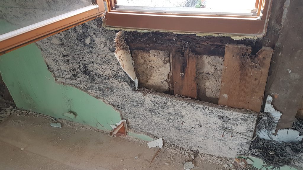 Mein persönlicher Hass ist ja die Heraklithplatte. Wie ich gelernt hab, ist das ein hochwertiger, natürlicher Dämmstoff aus Holzwolle und einem Bindemittel wie Zement. Sie wird zur Wärmedämmung eingesetzt, dient aber auch dem Brandschutz und der Schalldämmung. Aufgrund ihres wunderschönen äußeren Erscheinungsbildes nennt man sie auch Sauerkrautplatten. Hier zur Dämmung der Wände innen verwendet und mit rostigen Nägeln quasi ins Holz versenkt, ist sie für mich entweder kaum zu bewegen oder löst sich in ihre fiesen, faserigen Einzelteile auf. Und da wir nicht wissen können, ob in der 50er-Jahre-Version dieses grauen Alptraums noch irgendwas anderes beigemengt wurde, kommen alle raus.