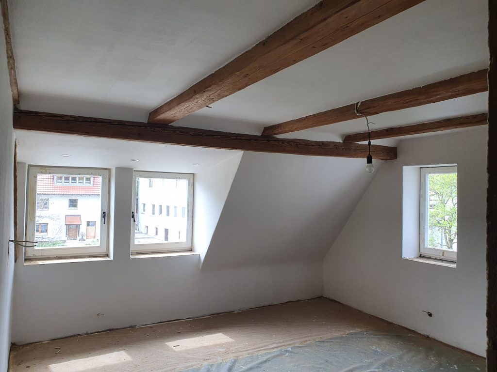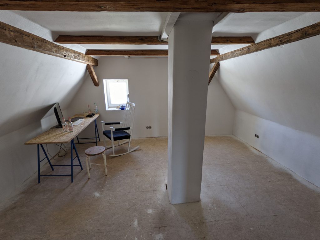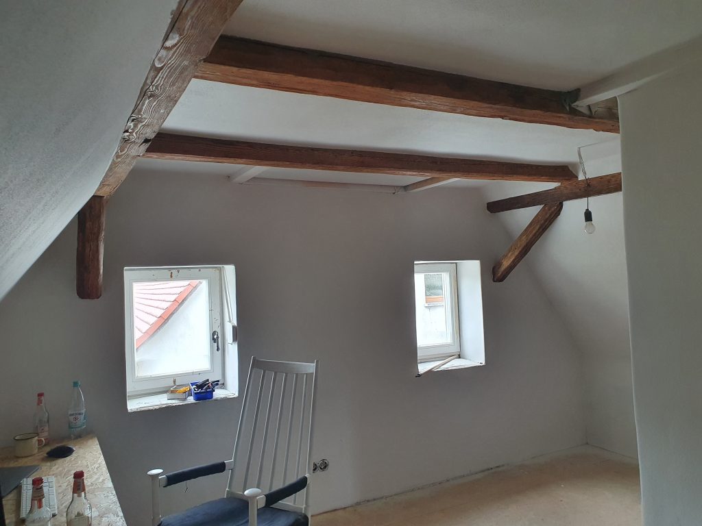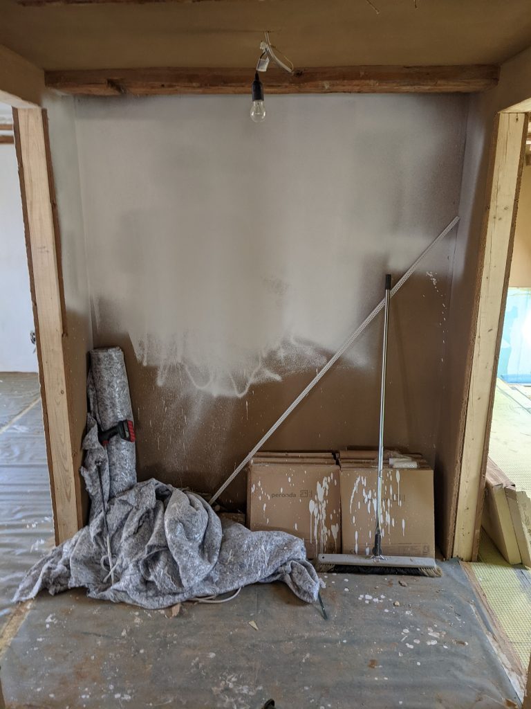 Als erstes gehen wir mit Pinsel auf die Wände im Bastelzimmer los. Ein paar Stunden später sieht man: nach einaml streiechen is das noch nix. Weder Kreuzschlag noch klassisch Hin-und-Her deckt nicht und farbpigmente des Feinputz werden gelöst mitgenommen… überzeugt nicht.