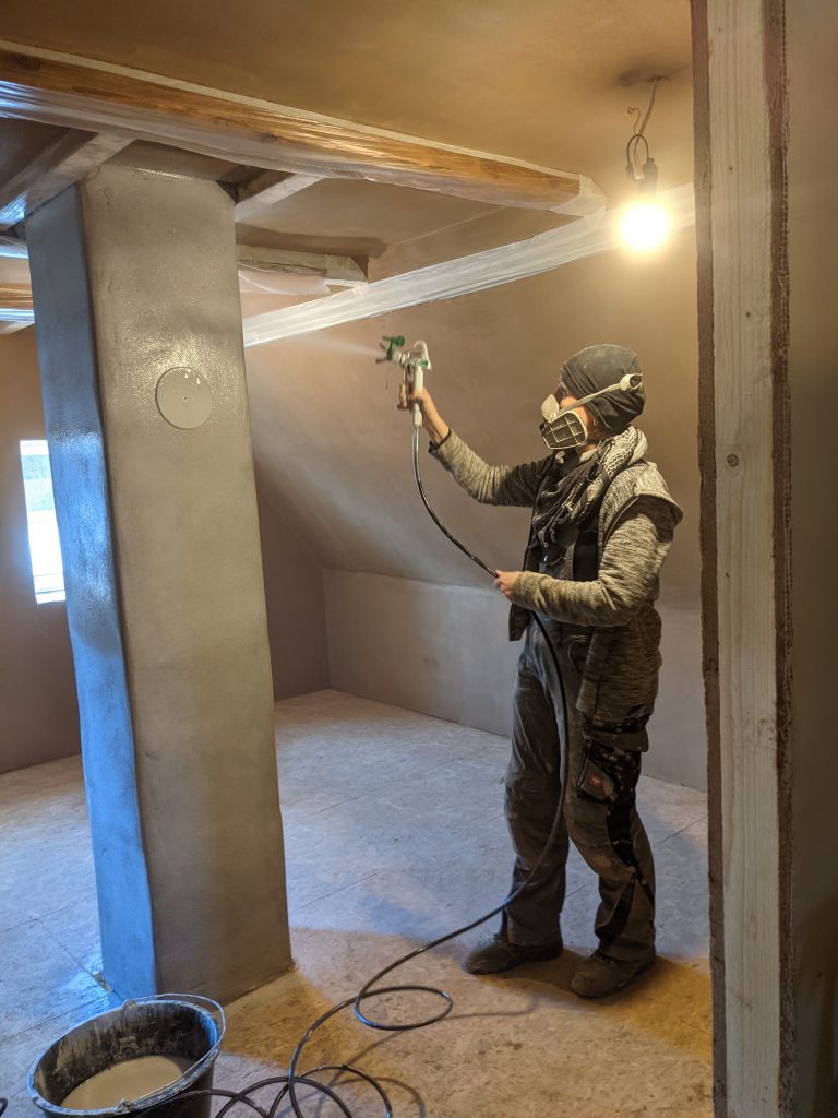 Und dann das von mir lange gewünschte Farbsprühgerät! Ich hab das immer in Bausendungen gesehen und wollte das unbedingt machen. Aber für Lehmfarbe ist das gar nicht so einfach, denn da die Farbe so viskös und grobkörnig ist, braucht es eine große Düse und deshalb viel Druck. Aber verdünnt geht die Farbe mit unserem Gerät an die Wand. Leider muss mann penibel abkleben und zwar alles. Denn es sprüht halt überall hin. Und auch hier bracuht es mindestens zwei Durchgänge, wir haben drei gebraucht.