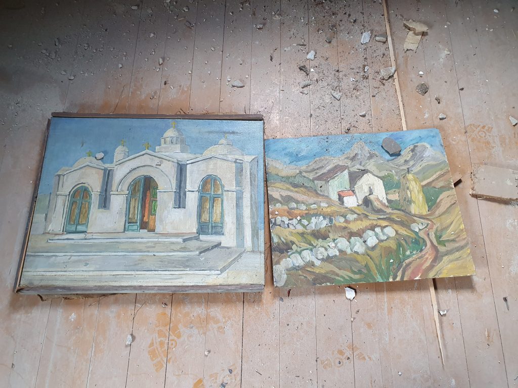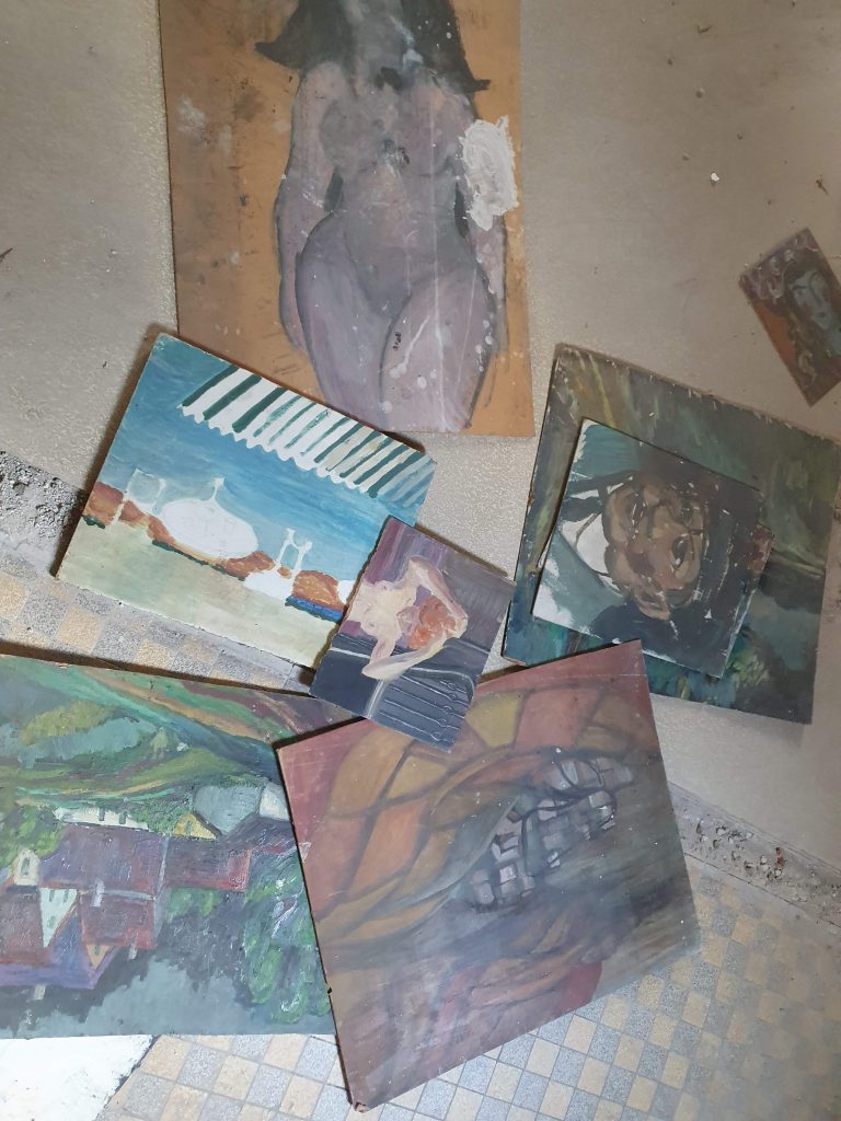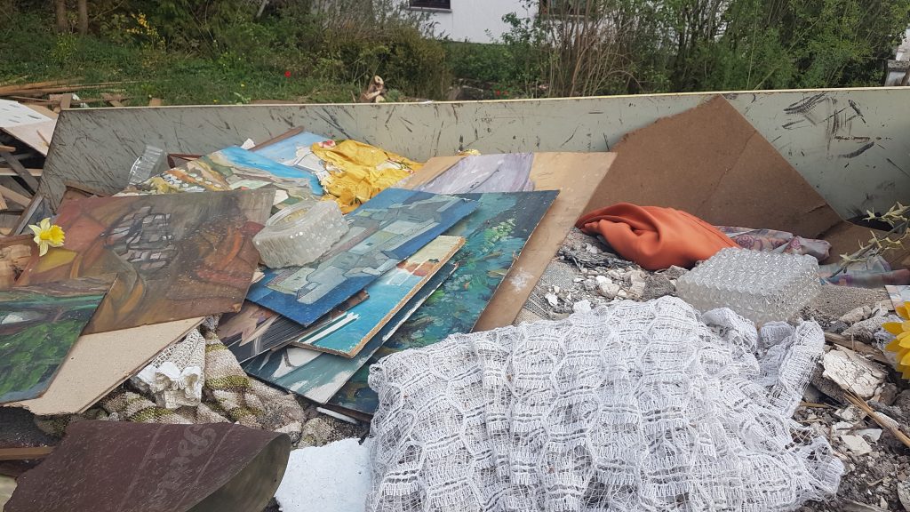 Ich hatte ja vorher ein Gefühl, dass das viel Müll sein würde. Aber ich hatte es noch unterschätzt! Kartons, Teppiche, Holzbretter. Die Fernsehantenne, Rohre, Lampen. Schindeln und Fliesen. Das alles versteh ich ja noch. Aber dann war ich schon auch froh über meine Schutzmaske und meine Handschuhe. Meine Rüstung gegen alles Garstige! Ich bin recht ekelresistent und Spinnenweben und ihre Bewohner sind mir Wurst. Aber das war nicht schön: schimmelige Stoffe, alte Unterwäsche, die Hinterlassenschaften der Nager, sogar ein gebrauchter Kaffeefilter. Und es war gruselig: ein Set alte, zerfressene Handpuppen aus Pappmaché. Chuckies Familie! Ich hab nicht mal abwarten können, bis sie photographiert werden konnten, sie sind im Conainer gelandet, von wo aus mich dann einige der Köpfe noch böse angeschaut haben. Und es war auch skuril: dutzende alte Bilder und Rahmen. Ich bin kein Fachmann, aber hier hat sich jemand schon viel Mühe gegeben. Leider is nix nach meinem Geschmack bei rumgekommen. Vielleicht haben wir die Werke eines unerkannten Genies im Container begraben… ich glaube aber eher nicht.
