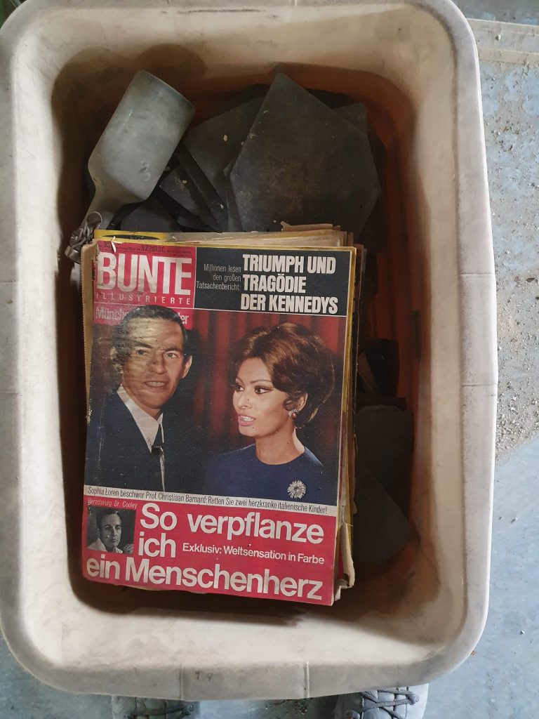 Viele Leute finden ja auch tolle Sachen auf ihrem Dachboden. Unsere Ausbeute war überschaubar: ein paar alte Beschläge, ein runder Bilderrahmen, gläserne Bierhumpen und ein alter Stuhl, der aber nur noch zum Sitzen auf der Baustelle taugt. Witzig ist es immer, alte Zeitungen zu finden. Eine Zeitreise: die Queen in jung, die Herztranzplantationen als Sensation und diese Frisuren!