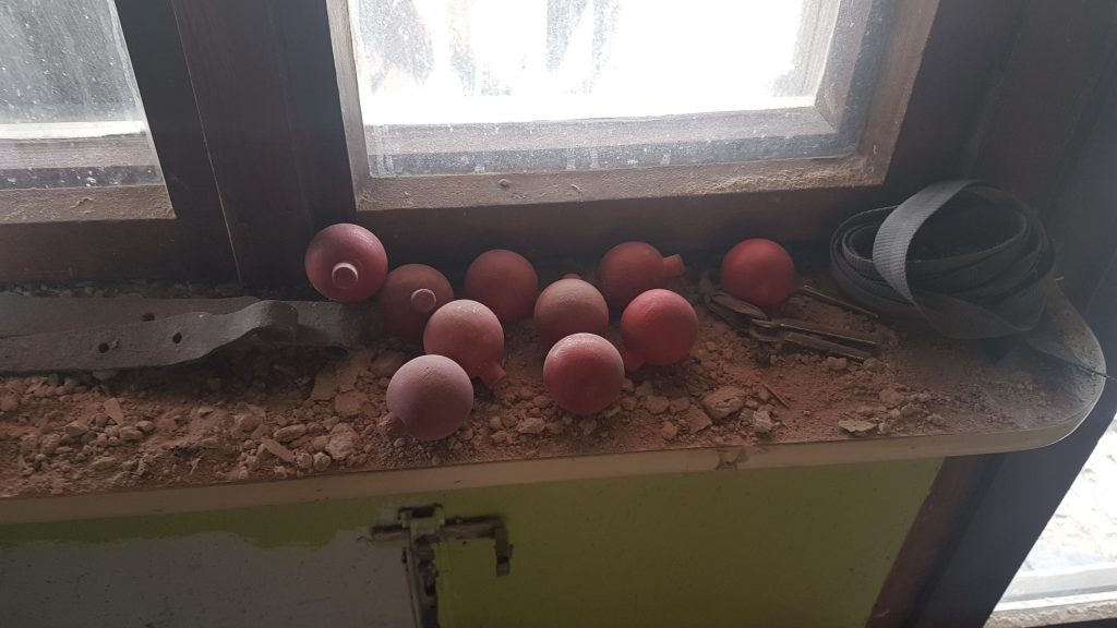Wiederverwenden werden wir vermutlich die alten Fenster, die vermutlich im Erdgeschoss und ersten Stock verbaut waren. Jetzt wissen wir auch, wie es mal ausgesehen hat: oben abgerundet, weiße Rahmen, acht Kassettten. Vielleicht bauen wir uns ein Gartenhaus und da kommen die dann rein. Und die Schieferschindeln, die hier noch überall liegen (das Haus war früher damit gedeckt), kommen da drauf. Und ein running gag: überall sind uns rote Holzkugeln in die Hände gefallten. Auch hier wieder. Wir haben jetzt zehn Stück davon, was wir damit machen wissen wir noch nicht, aber irgendwas lassen wir uns einfallen.