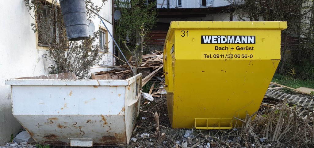 Und das musste erstmal alles runter in den dritten, von da in den zweiten Stock und von da über eine von Chris gebastelte Schuttrutsche (die für den Schutt funktioniert nicht, verstopft dauernd) in den Container. Styropor und Papier entwickelten aerodynamische Qualitäten und versuchten, bis nach Hersbruck zu fliegen… Was für eine veritable Scheißarbeit! Alles dreimal anfassen und das teilweise, weil unhandlich und nicht schaufelbar, sogar wortwörtlich… Ich schleppe lieber einen ganzen Tag Steine, als drei Stunden diesen mockigen Kram!