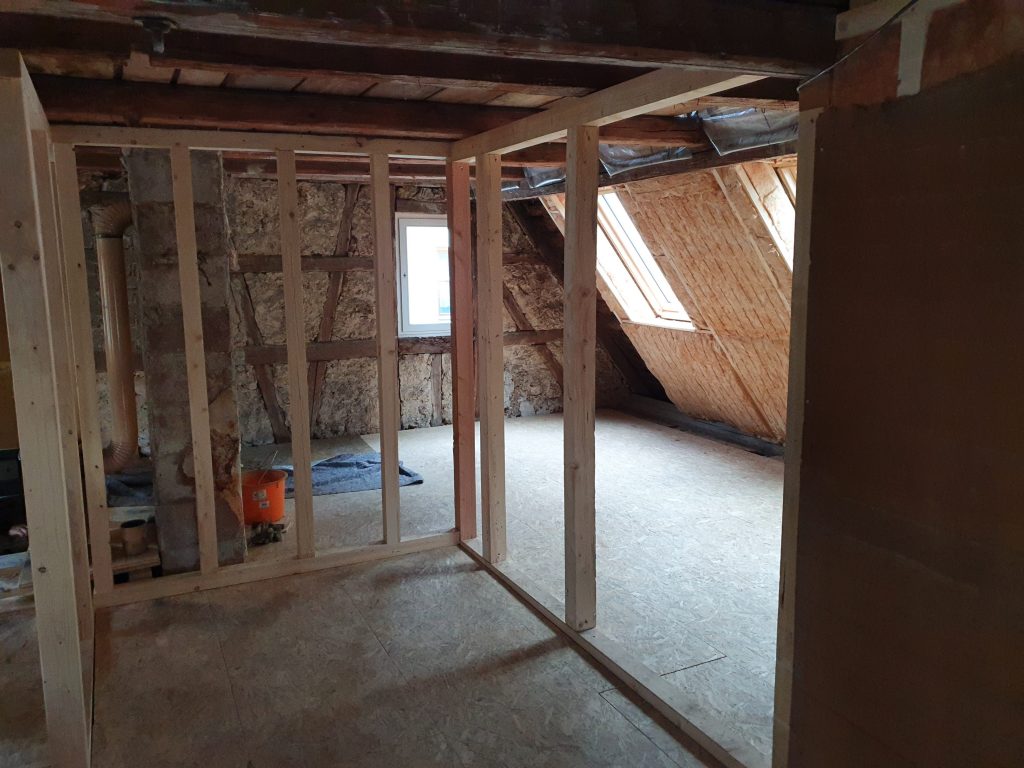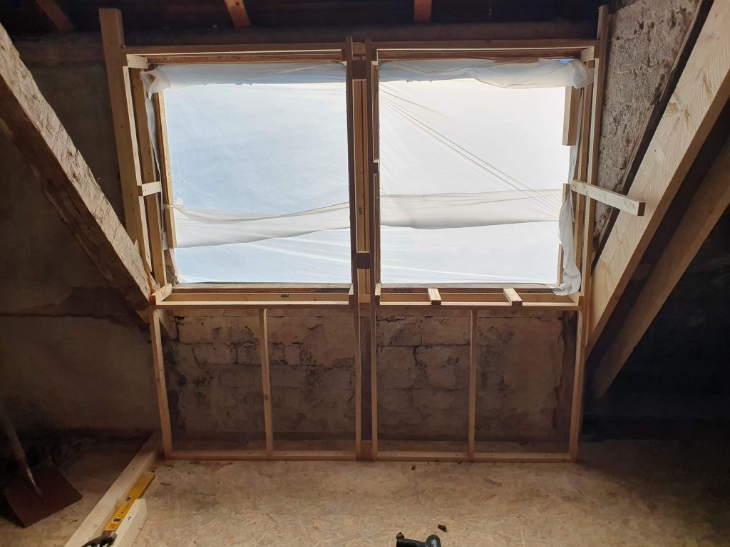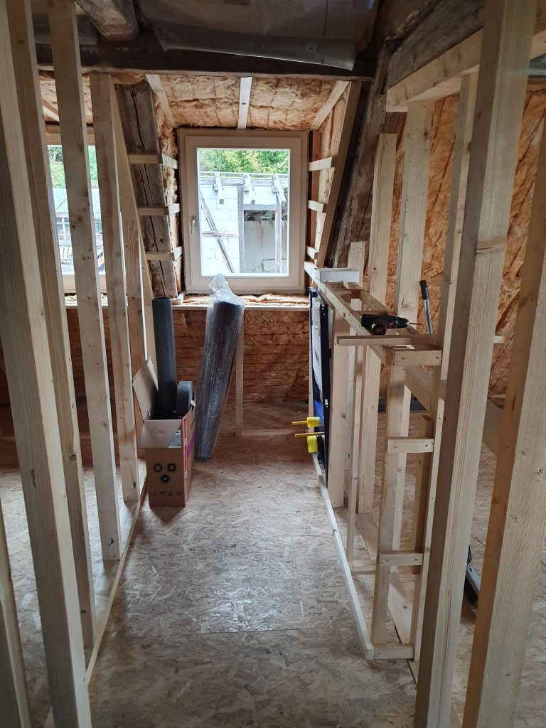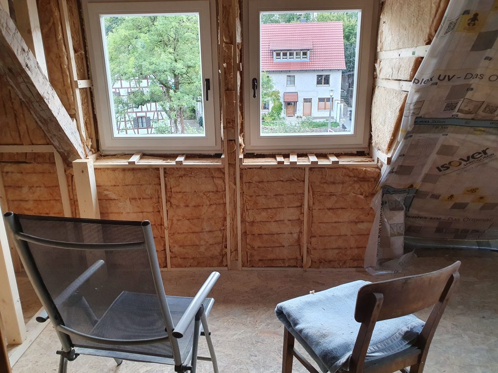 Das war uns wichtig, da ja am Dienstag der Woche die neuen Fenster kamen und wir sehen wollten, wie das dann aussieht. Denn die Dämmung ist ja schon fast die Stärke der endgültigen Wand, so dass man abschätzen kann, wie tief die Fenster liegen und wie z.B. einen Fensterbank aussehen würde. Hier hat Chris die Rahmen gebastelt, in die die Dämmung dann eingepasst wird.
