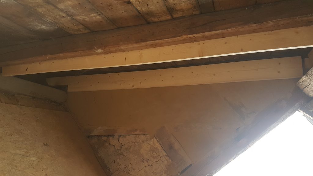 Also diese soweit fertigstellen, dass die Dampfbremsfolie eingezogen werden kann. Zum Thema Dämmung muss ich ja nicht mehr viel sagen… es ist ein notwendigen Übel, aber es bleibt einfach furchtbar. Vor allem, wenn man Schrägen mit vielen Ecken und Diagonalen hat… Ihr wisst ja schon: es juckt! Überall. Aber v.a. in den Augen! Aber es geht voran! Am Ende der Woche sind nurmehr drei Sparren übrig, die noch frei bleiben, weil die daran anschließenden Giebelwände erst noch mit Lehm geputzt werden müssen. Und natürlich eben diese Giebelwände. Sonst alles gedämmt!