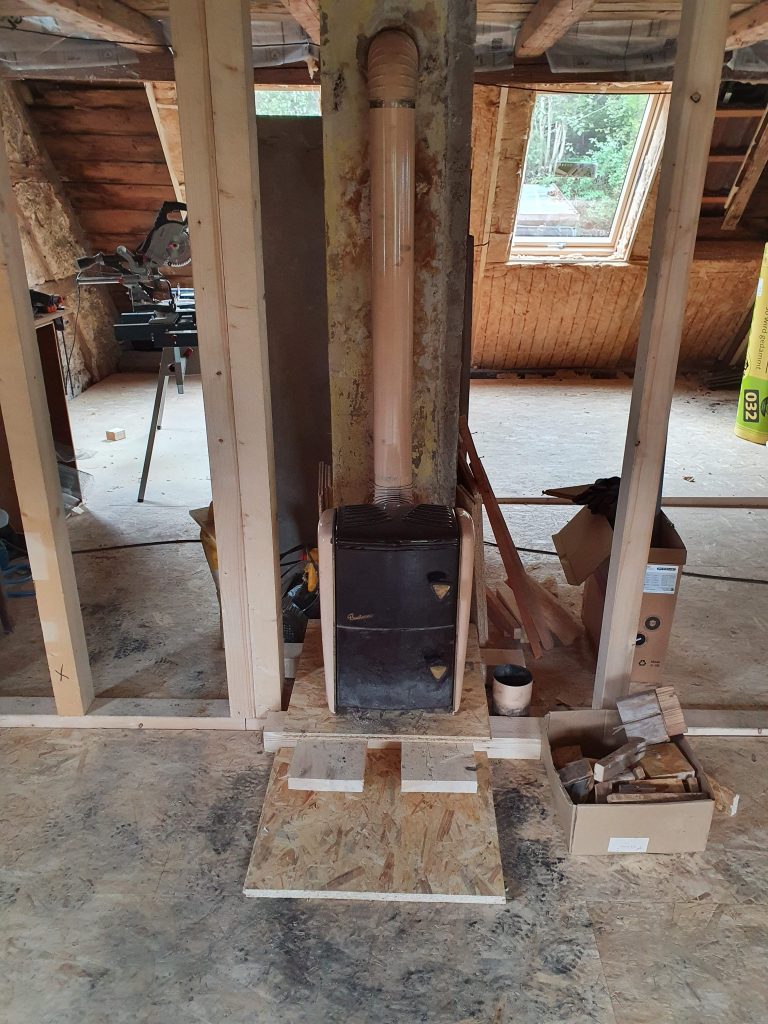 Wir haben unseren ersten Baustellenofen! Die Fensterbauer haben Chris geholfen, den Klotz hochzuschleppen, seitdem ist es sehr viel wärmer. Und wir können auf dem Ofen auch unser Essen warm machen!
