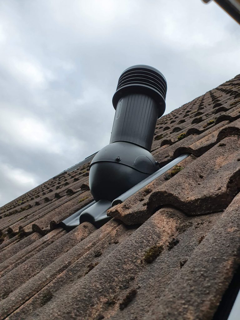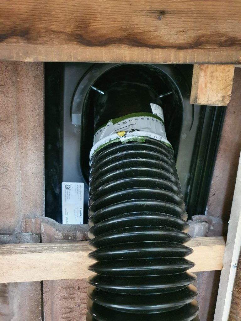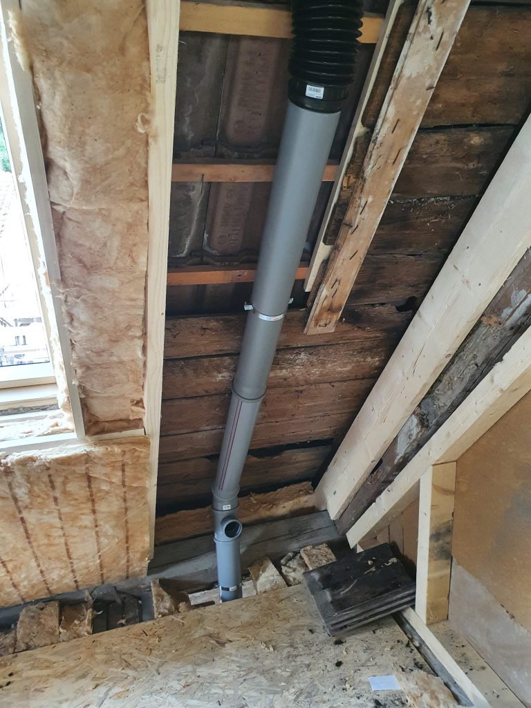Da wir ja auch das selbst machen, hat Chris schon mal das erste Rohr zum Entlüftungsziegel (den braucht man, damit in den Abwasserrohren kein Unterdruck entsteht) verlegt.