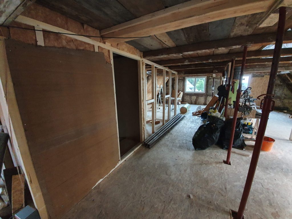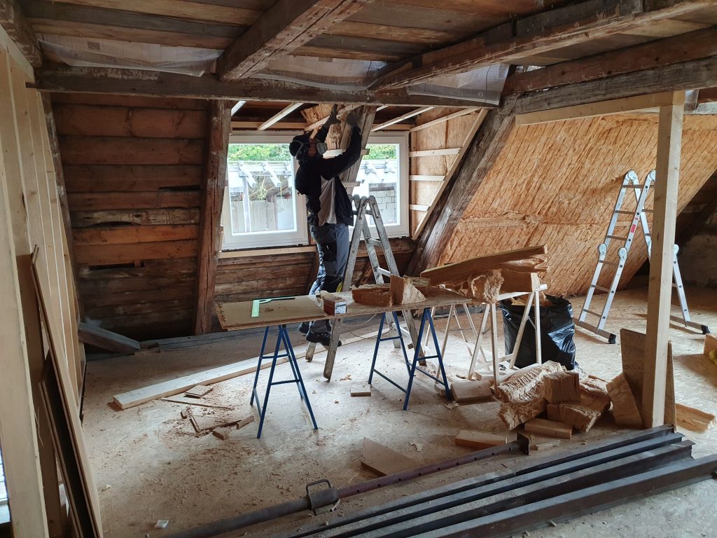 Dazu mussten erstmal die Reste des Balkons weg! Denn wir hatten uns ja für ein paar Zentimeter mehr Deckenhöhe entschlossen, also mussten die Stahlträger, die den alten Balkon gehalten und in unser Esszimmer in spe ragten, raus. Chris war in der Woche vor unserem Urlaub in luftigen 6 Metern Höhe den aussen liegenden Teilen (Geländer, Boden) zu Leibe gerückt. Die Stahlträger leisteten entschlossen Wiederstand! Da riss auch einfach mal das Stahlseil der Lastenwinde! Letztlich hat Chris aber Kraft seines Willens und seiner Oberarme gesiegt! Stahlträger raus! Nachdem wir dann in mehreren Touren wieder Baumaterial ins Haus geschafft hatten und Chris diese heroisch in den zweiten Stock geschleppt hatte, wurden auch die letzten Balken angelascht und mit Latten für die Fehlbretter versehen. Die durfte ich dann wieder einpassen (ich gestehe, das war eine meiner Lieblingsbeschäftigungen) und gemeinsam haben wir die letzten 2,5cm dicken OSB-Platten verlegt. Fertig! Jetzt ist es ein großer Raum!
