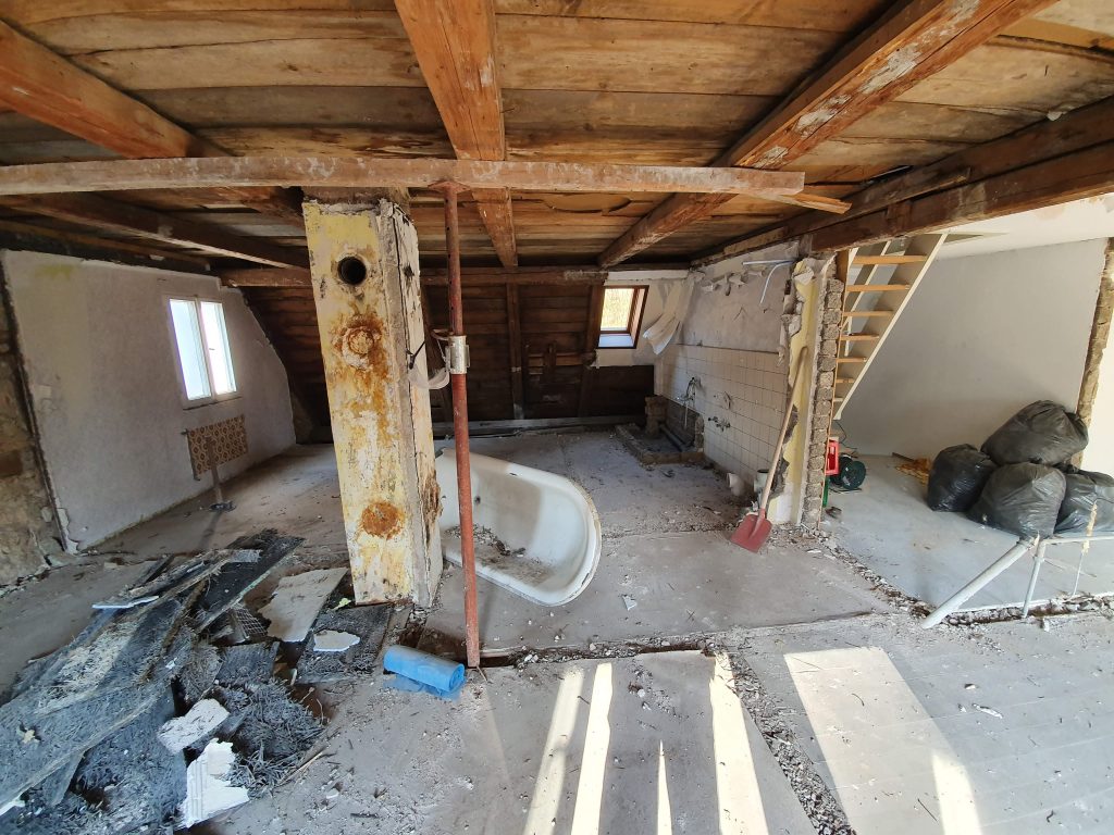Unter den Dielenbrettern ist noch mehr moderige und verfaulte alte Dämmwolle und schlecht gemachte Lattungen, die schon morsch sind. Die Balken darunter sind glücklicher Weise stabil und so können wir die Deckenbalken wieder abstützen.
