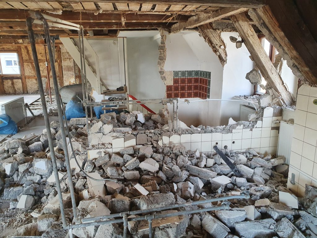 Und dann noch eine neue Erkenntnis für mich und meine Hammertechnik. Wände die beidseitig mit Fließen beklebt wurden sind extrem stabil. Da reicht es nicht, wie bei den anderen einfach mal drauf los zu dreschen und nach zwei kräftigen Schwüngen ist die Mauer vor Angst zerbrochen! NEIN. Diese Mauern wehren sich bis aufs Blut. Und zwar MEINS!