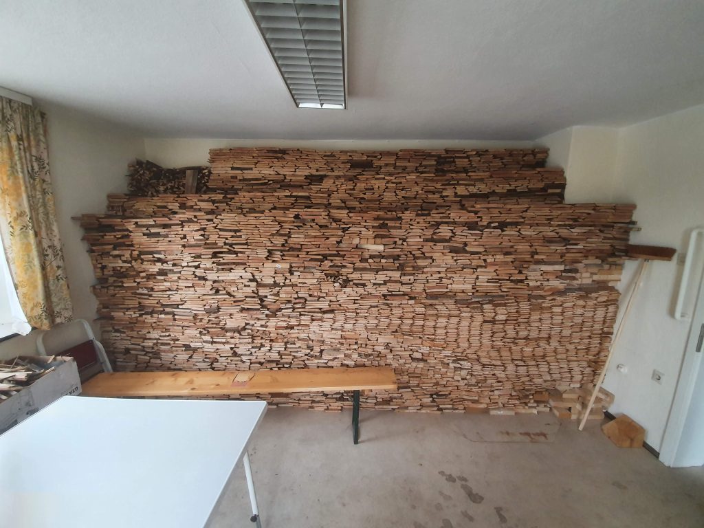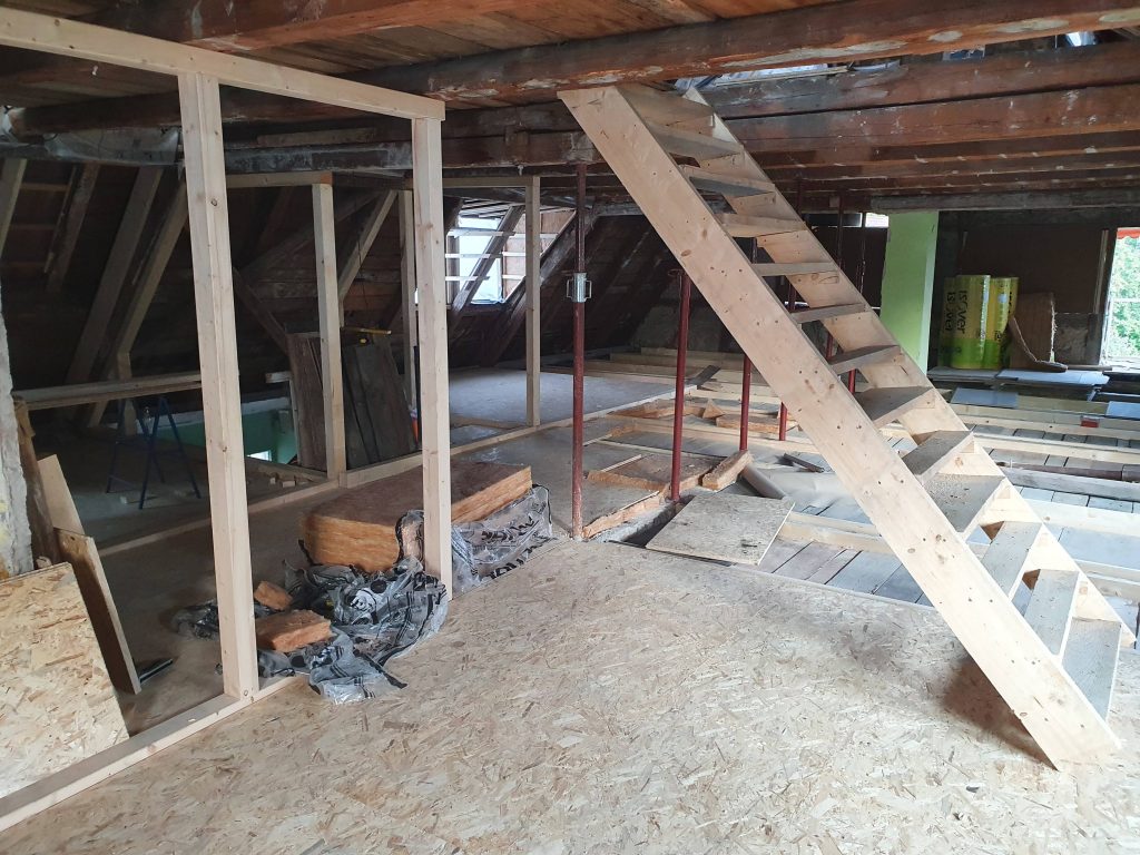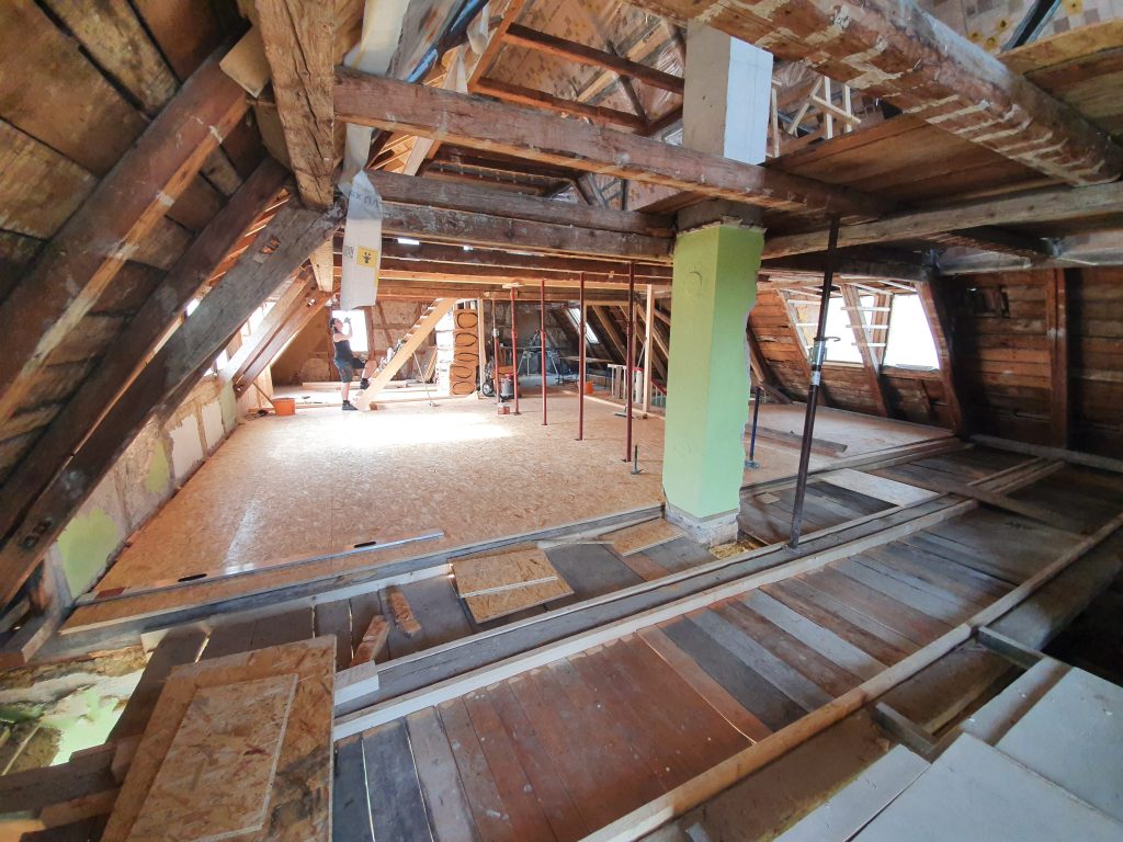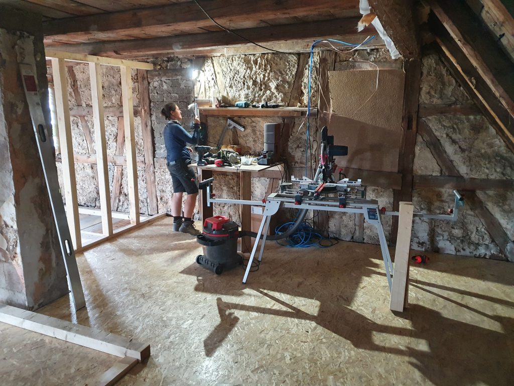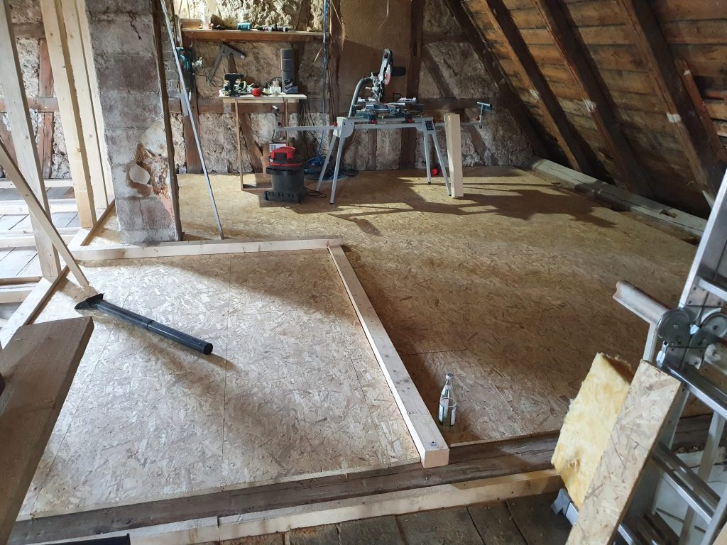 Im zweiten Stock gibt es endlich wieder einen Boden! Chris hat die Balken angelascht – also mit Bohlen links und rechts verstärkt – und damit auch wieder ausgeglichen. Der Nivellierlaser hats gezeigt: die Balken waren nicht unterschiedlich hoch, das war ein deutsches Mittelgebirge! Unterschiede um mehrere Zentimeter zwischen zwei Balken und insgesamt von ca. 20cm. Aber jetzt ist alles gut. Es wurden Latten angeschraubt auf denen jetzt wieder Fehlbretter liegen. Auf diesen liegt Rieselfolie und Trittschalldämmung. Und da oben drauf liegen 25mm OSB-Platten. Alles in einer Ebene. Wunderschön.
