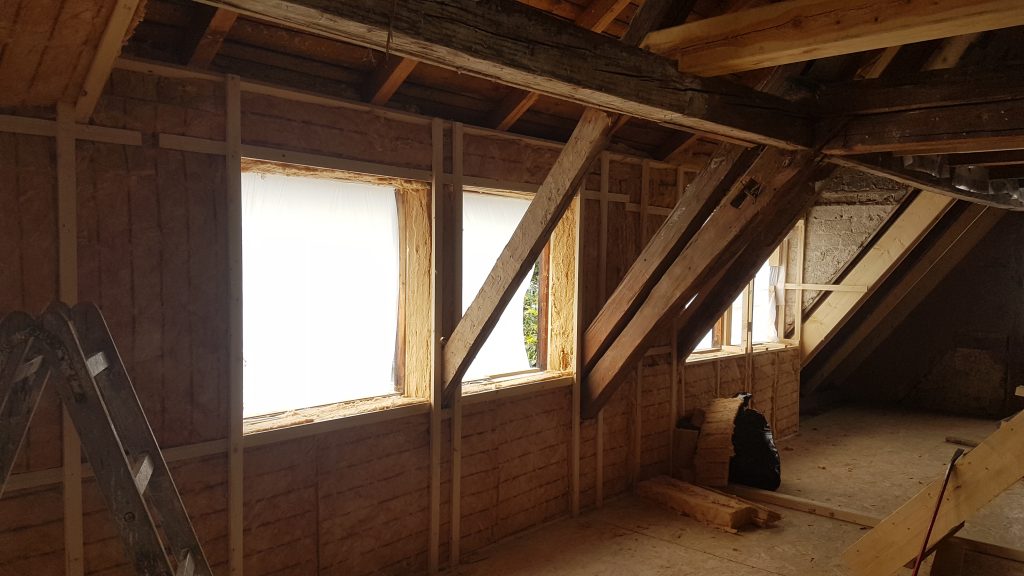 Und noch ein echter Hingucker: Chris hat die Fensterlaibungen neu gemacht und in der Gaube schon mal die Unterkonstruktion davor gebaut. Jetzt ist dieser Bereich gedämmt und man sieht, wie auch das aussehen wird. Vor allem, wenn am Abend das wundervolle goldene Licht das Wohnzimmer flutet.