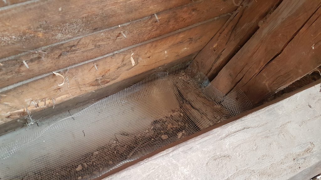Auch blöd fummelig: der Schutz gegen Nager. Da wir ja nicht wollen, dass sie wieder ein Königreich unter unserem Boden errichten, müssen wir ein engmaschiges Gitter in die Traufe tackern. Mache aus etwas piecksigem, störrischen, zweidimensionalen etwas lückenloses dreidimensionales. Auch da: ich bleibe dran!