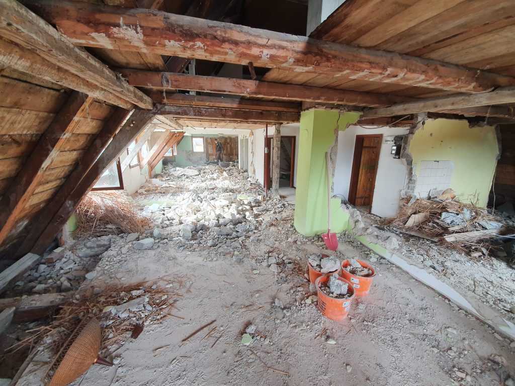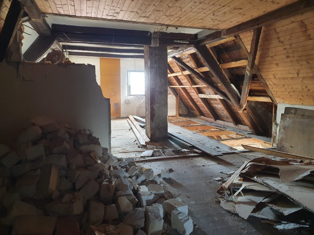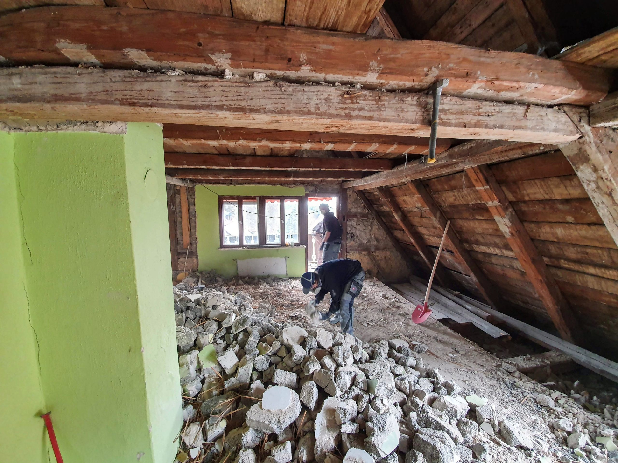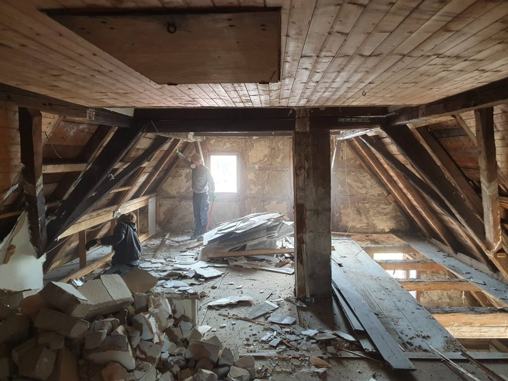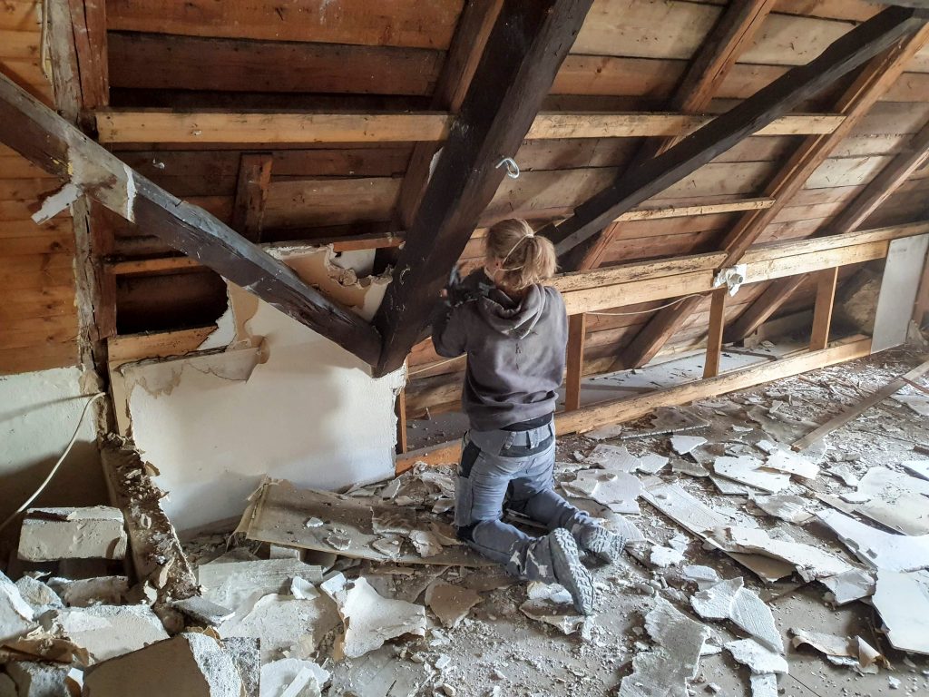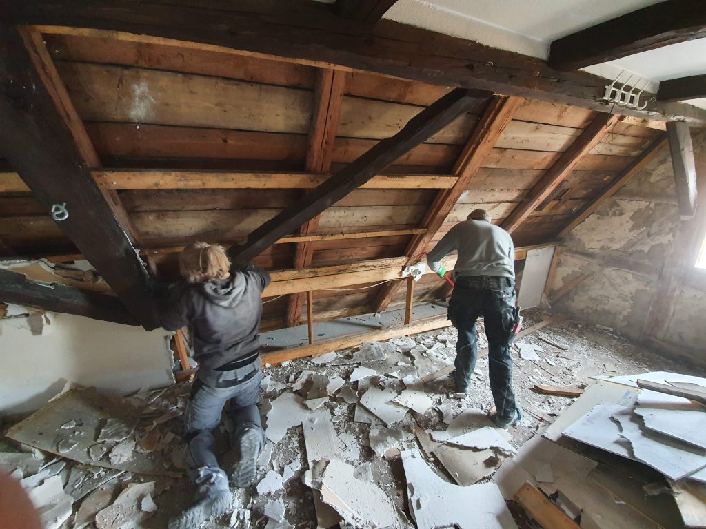 Die Decke nach oben ist offen und man kann den Boden wieder erkennen. Auch haben wir die Wände schon ordentlich frei gelegt. Das Dach ist zu 40% frei und wir können uns schon mal über die Dämmung Gedanken machen. Es werden aber wohl noch ein paar Container gebraucht, um den ganzen Schutt zu entsorgen.
