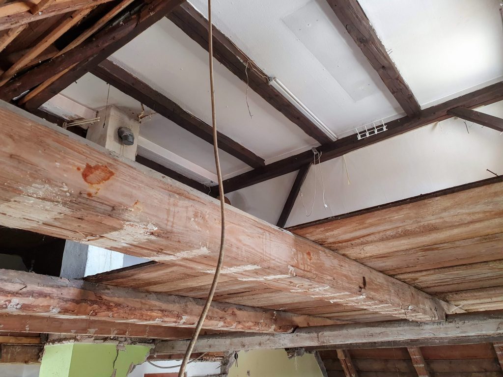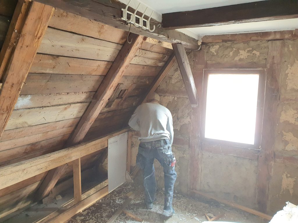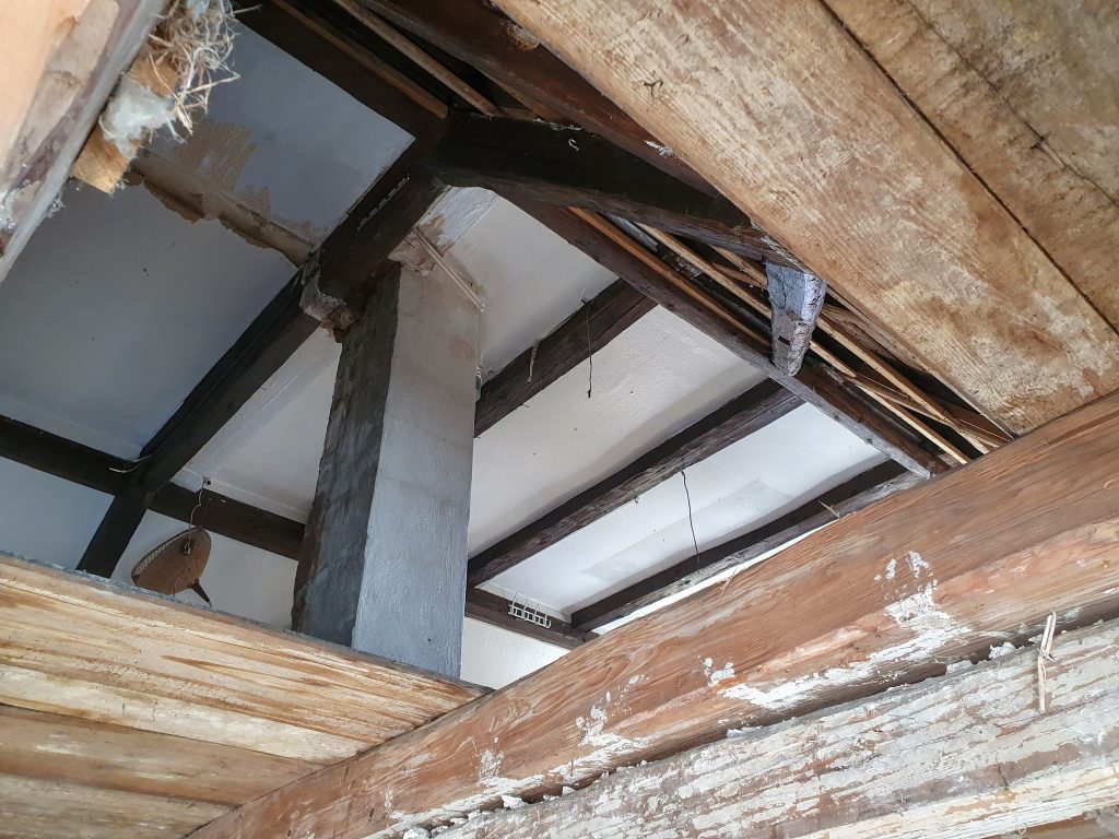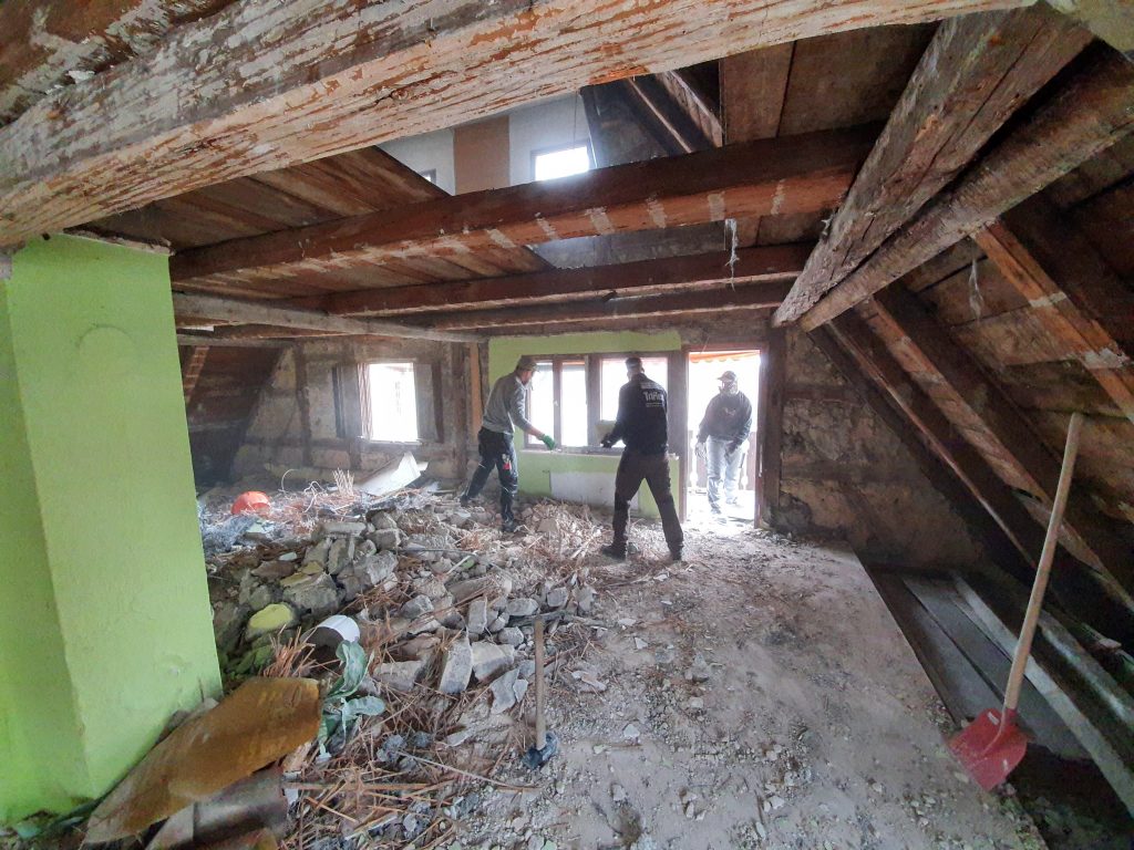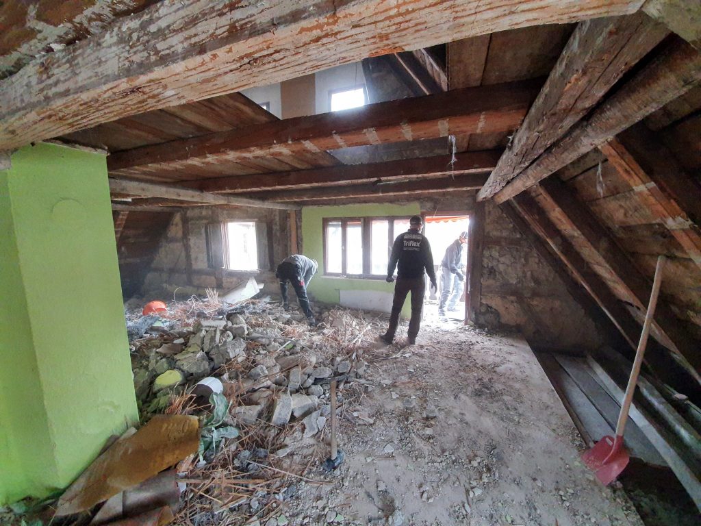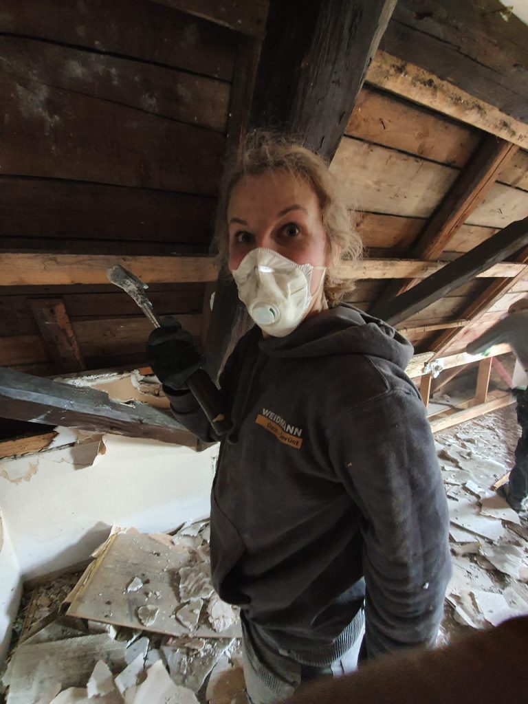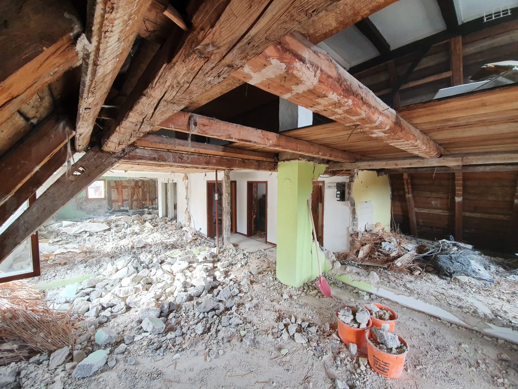 Die Decke nach oben ist offen und man kann den Boden wieder erkennen. Auch haben wir die Wände schon ordentlich frei gelegt. Das Dach ist zu 40% frei und wir können uns schon mal über die Dämmung Gedanken machen. Es werden aber wohl noch ein paar Container gebraucht, um den ganzen Schutt zu entsorgen.