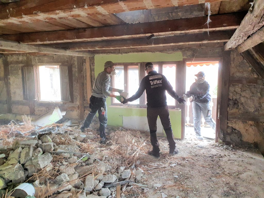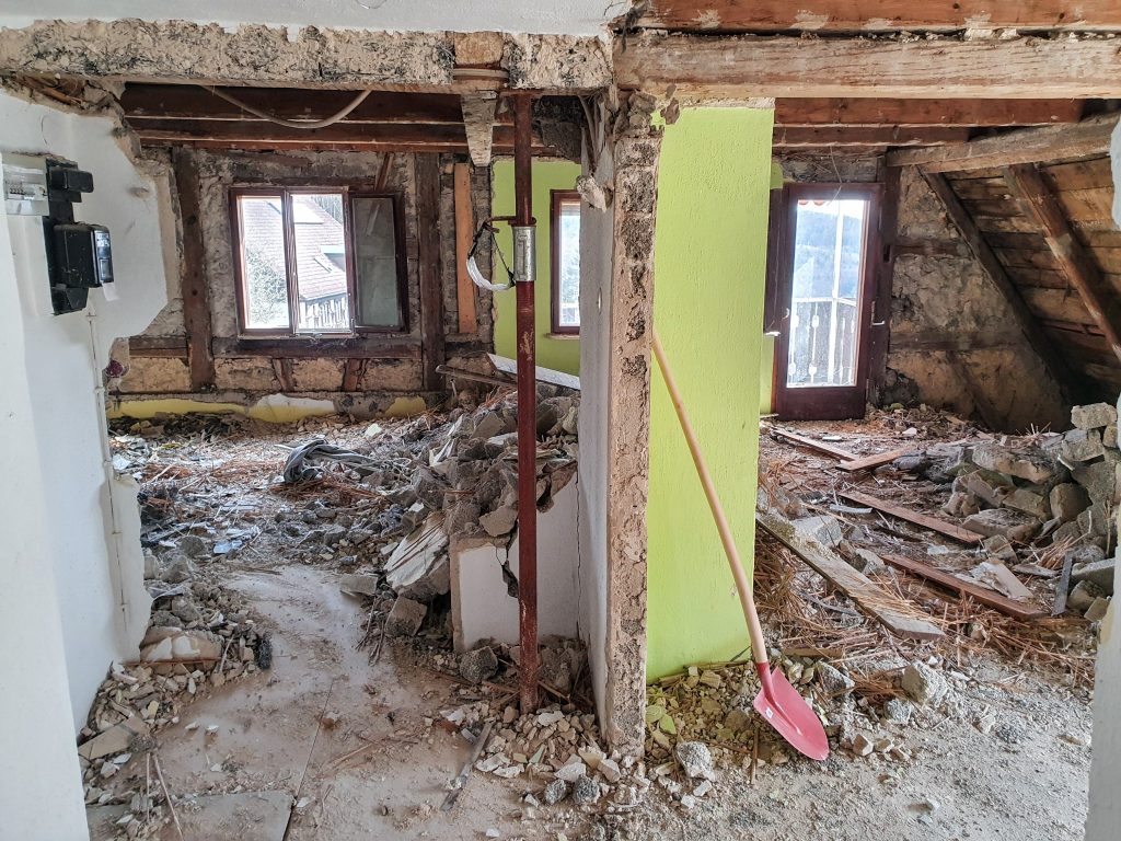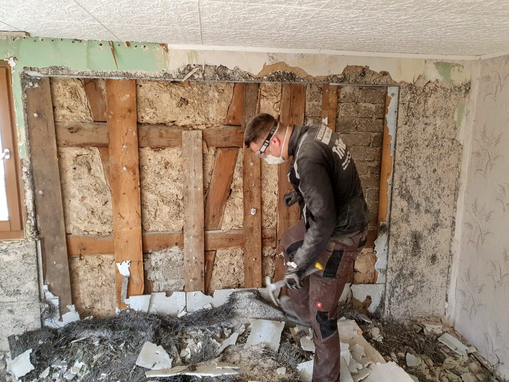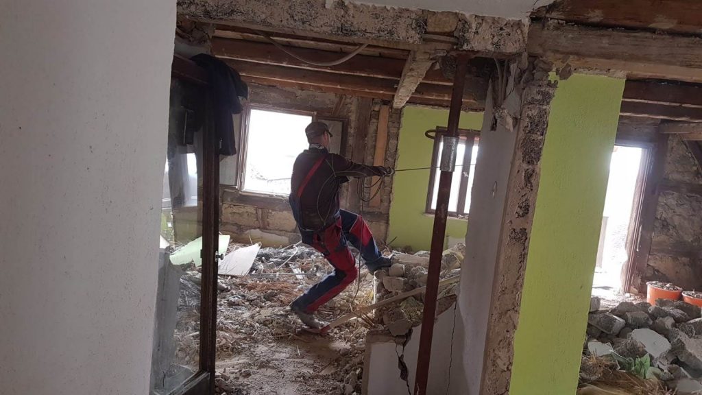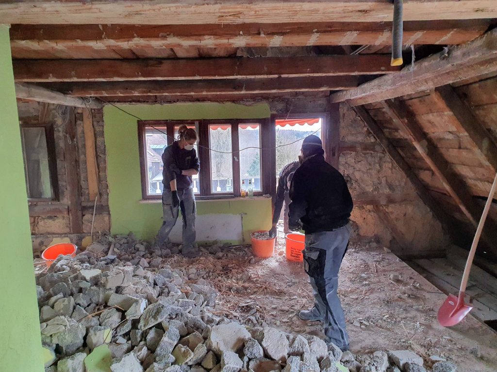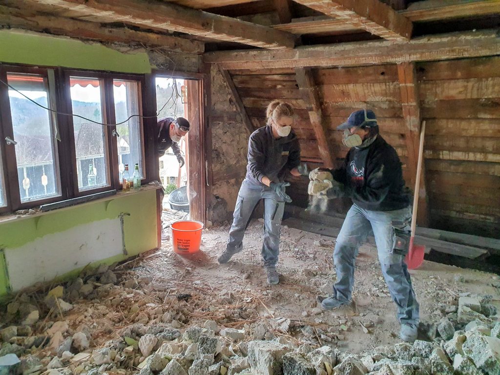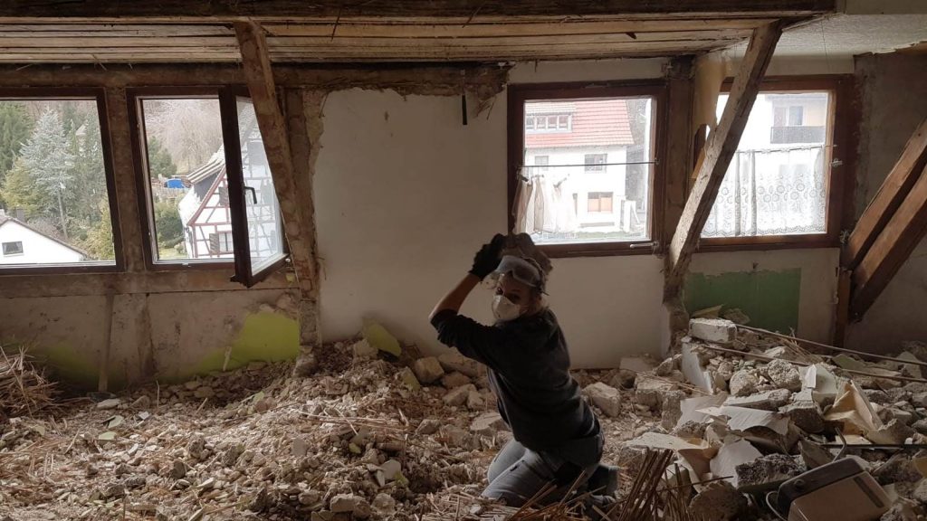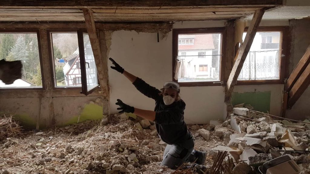 Neben dem Schutt entsorgen wurden aber auch immer wieder „Entspannungsübungen“ gemacht. Also Wände frei schlagen, Steine werfen oder klassischer, brutaler und befreiender Abriss.