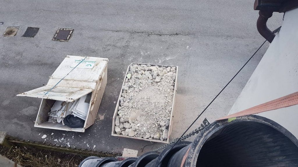 Also an die Arbeit und raus mit dem Müll. Mit Hilfe unserer Freunde haben wir unter Aufbringung all unserer Kräfte die Schuttrutsche an unseren Balkon gezimmert bekommen.