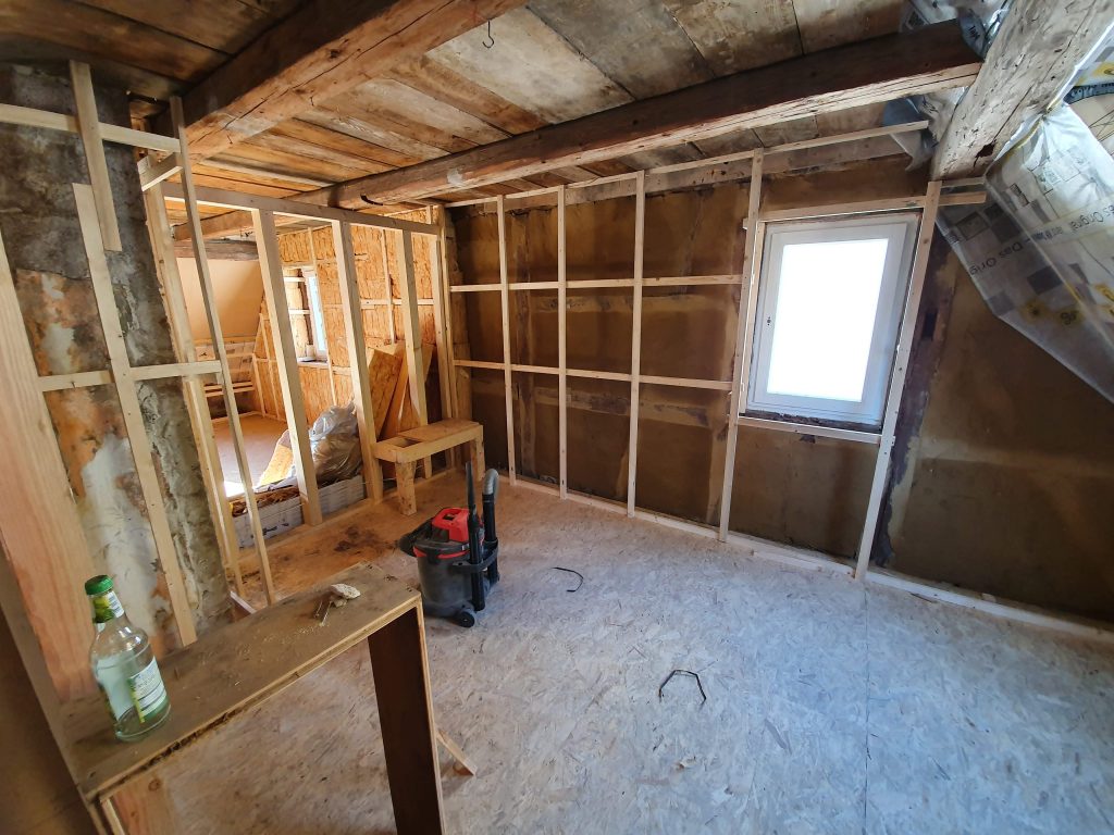 Ebenso der Lehmputz. Am Anfang war das noch eine wellige Geschichte, die eher schwierig zu dämmen ist, sind die anderen Wände ziemlich plan und gerade, so dass man die Dämmwolle nur noch zuschneiden muss.