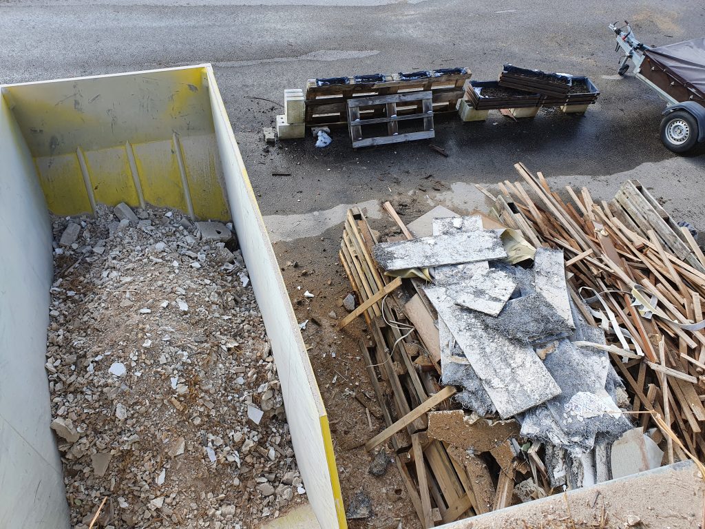 Darunter erwartete uns der schon berüchtigte Mix aus Schutt, Müll, Dämmwolleschnipseln Styropor und auch wieder Hinterlassenschaften von Viechern unbekannter Art. Das muss raus. Diesmal machen wir es uns – aus Erfahrung im 2. Stock – etwas leichter: wir sortieren erstmal aus, bevor wir weitermachen. Denn all der ganze Mül muss ja weg, das heisst, neben dem neuen Bauschuttkontainer, haben wir auch wieder eine große Vielfalt von verschiedenen Stoffen, die man getrennt entsorgen muss: Heraklid, Rigips, Tapete, Metall, Styropor, Dämmwolle und Holzabfall.