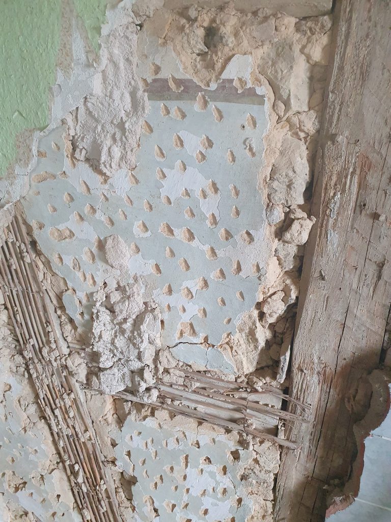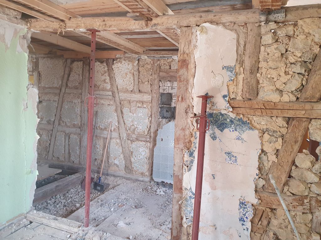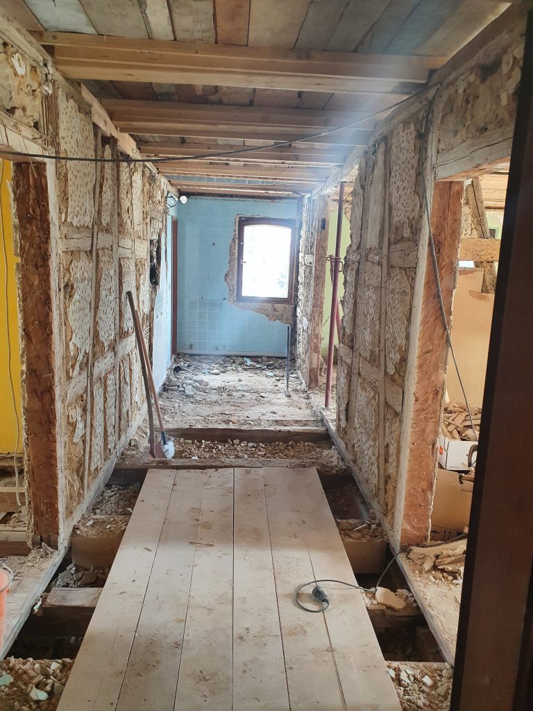 Als das geschafft ist, kommt dann auch mal wieder was Schönes: beim Putzabschlagen findet sich an allen Innenwänden unter den furchtbaren Farben richtig schönes Fachwerk!