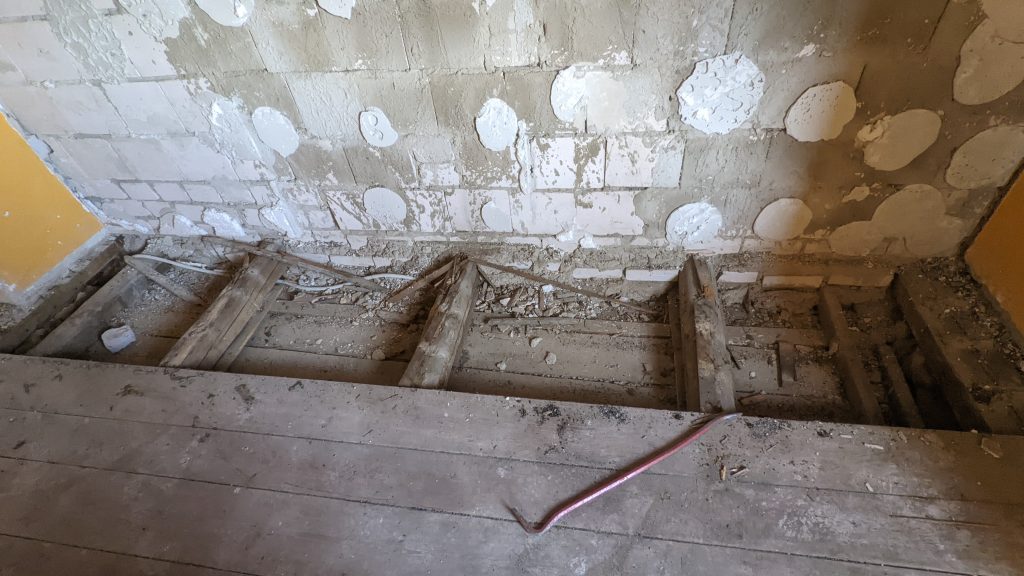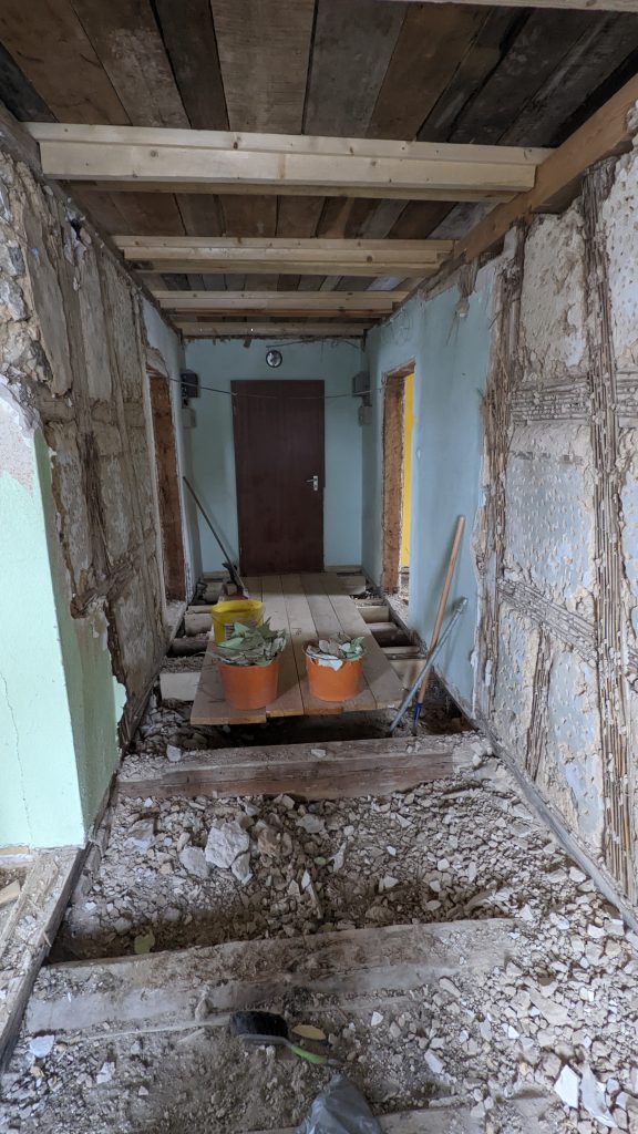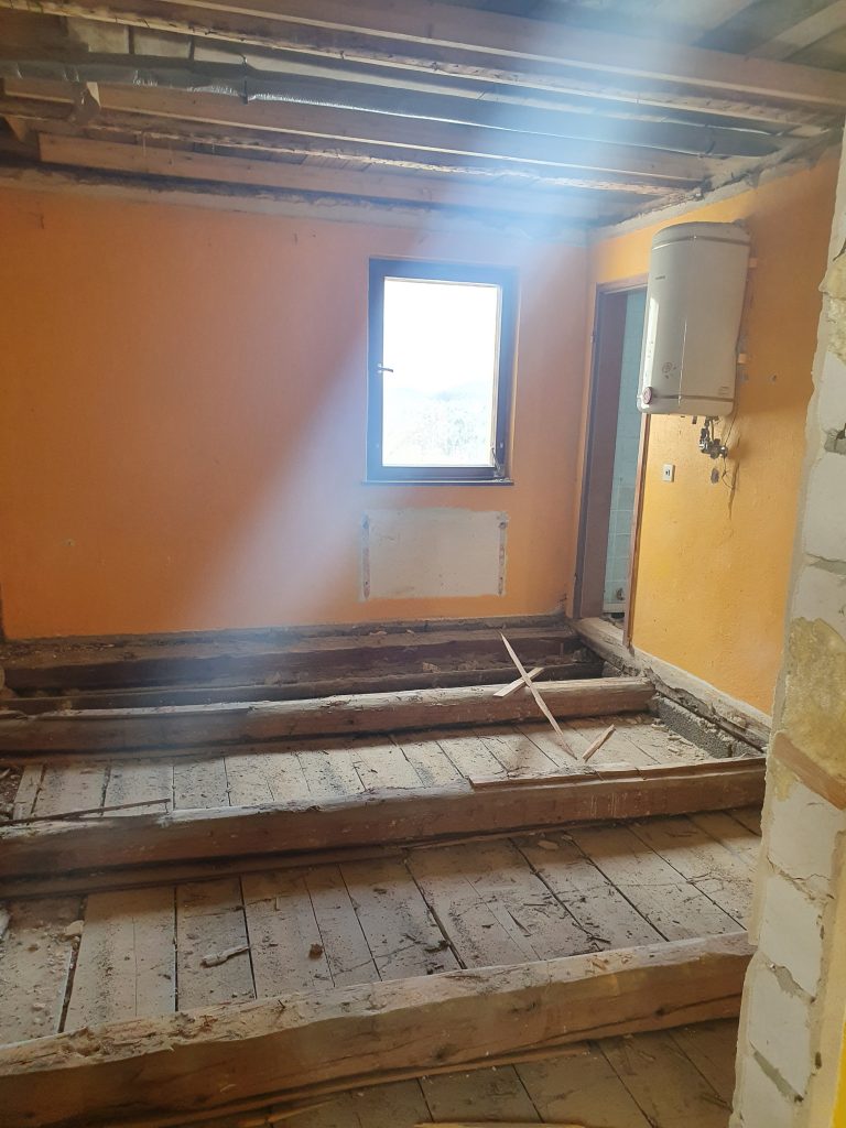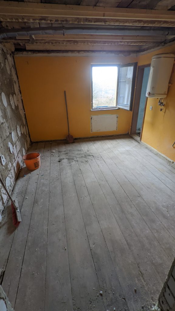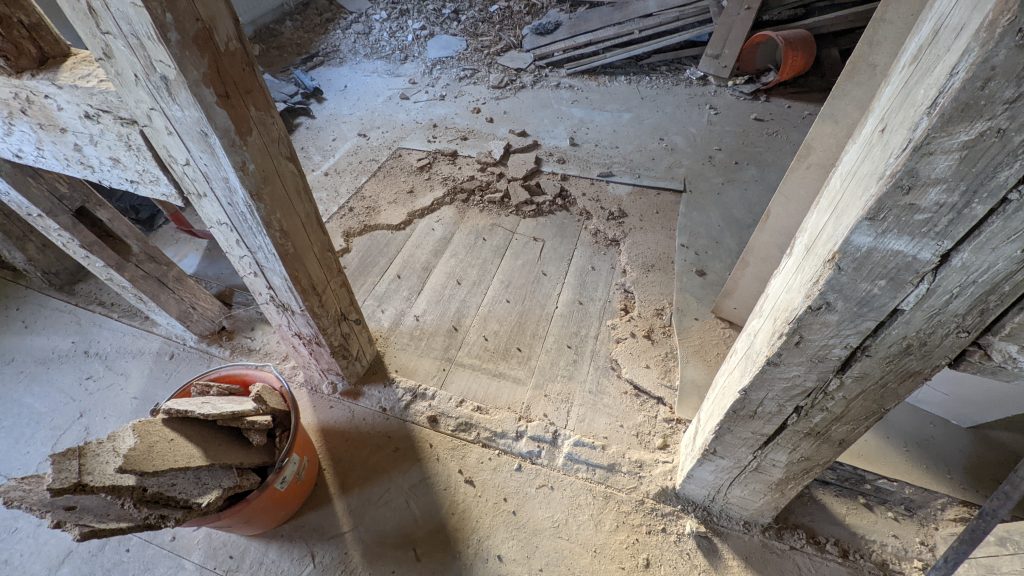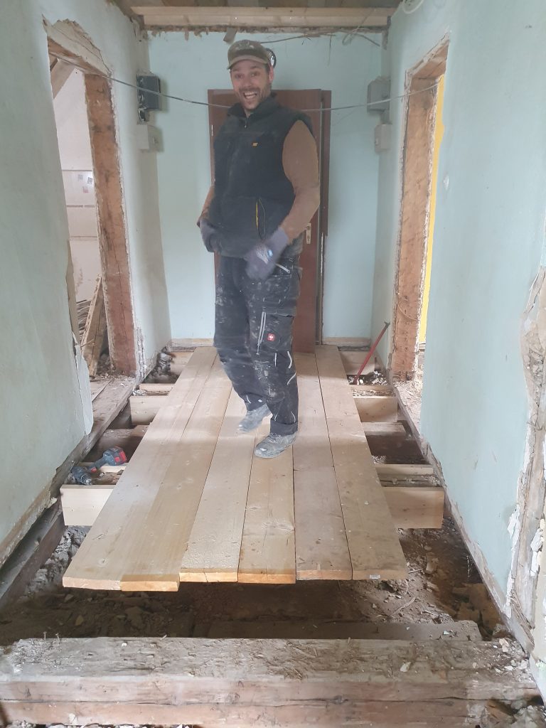Soweit so gut, aber wir mussten weiter in die Tiefe gehen. Also mussten wir den Holzboden erstmal ausbauen.