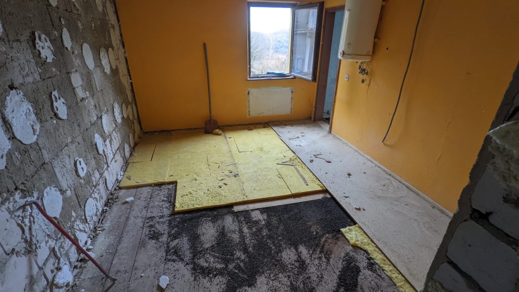 Im ehemaligen Bad haben wir ja den Boden schon aufgemacht und waren gan zzufrieden. Aber was verbirgt sich unter dem PVC der anderen Räume? Von Neugierde getrieben rückten wir den Böden zu Leibe. PVC weg, Holzplatten weg, ekelige Dämmwolle weg, Ausgleichsschüttung weg.