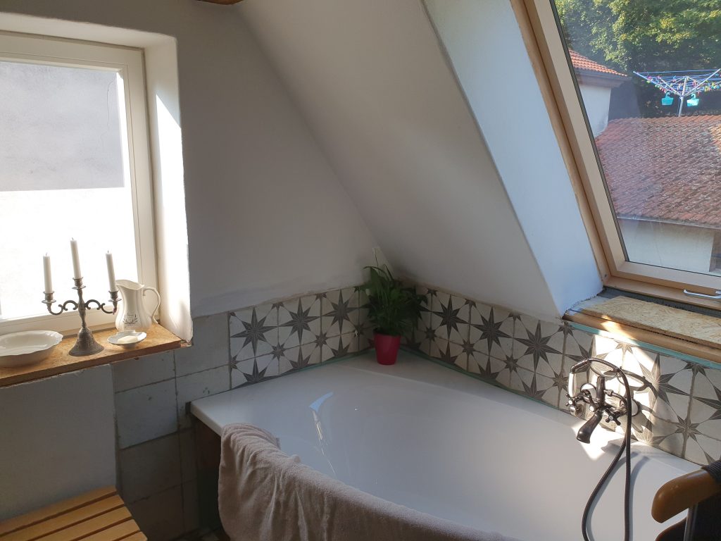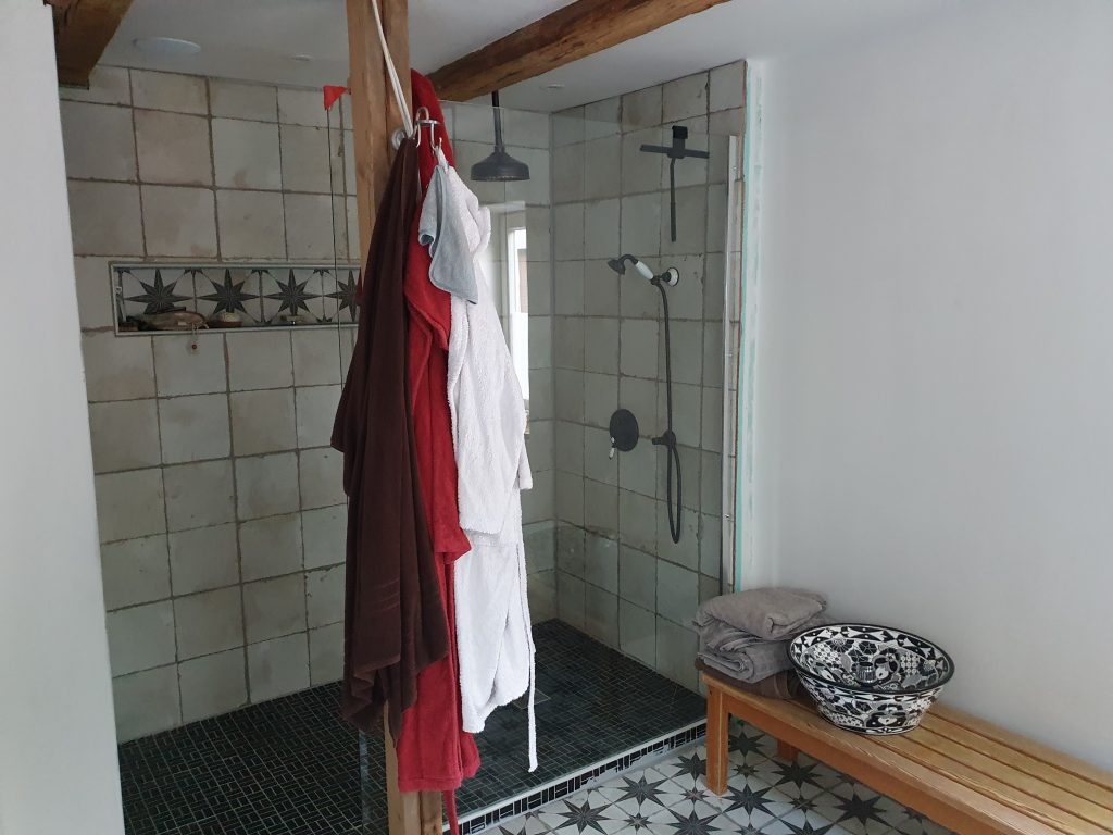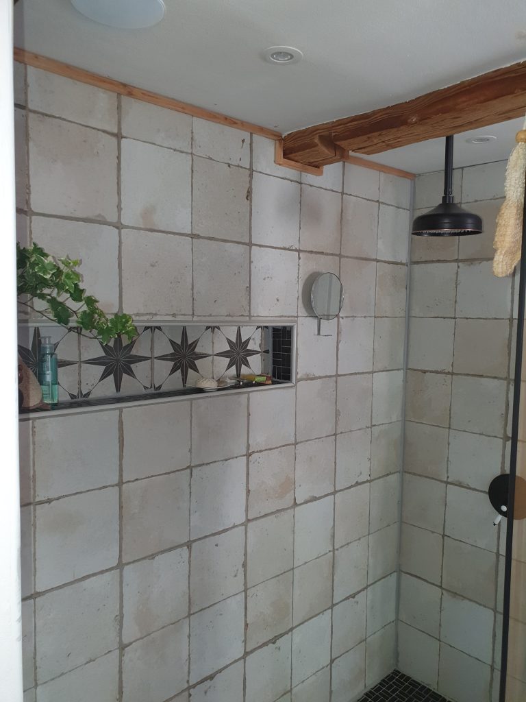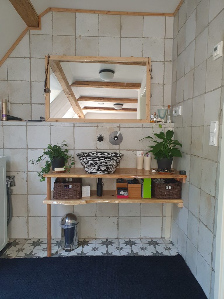 Dann das Badezimmer. Endlich haben wir alle Fliesen an der Wand und alles verfugt und silikoniert. Die wunderbare, riesige Dusche hat noch Zierleisten bekommen und wir haben sogar eine Duschblume. Und wir haben Holz geschliffen und einen Waschtisch gebaut, auf dem nun mein mexikanisches Waschbecken steht. Und darüber ein mit unserem Altholz gerahmter Spiegel. Die Badewanne hat ein Stützkorsett bekommen und gestern habe ich zum erstenmal gebadet… zu Opernmusik aus unserem Soundsystem. Auch hier sind wir noch voller Ideen: die Badewanne bekommt einen Holzrand und – auch wenn sie Chris nicht gefällt – ich werde die Leiter, die wir im Haus gefunden haben abschleifen und als Kleiderständer nutzbar machen.