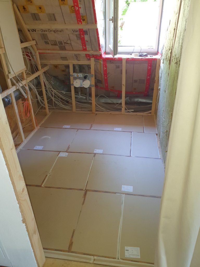 Seit gestern haben wir auch endlich die lange ersehnte Speisekammer. Wir haben hier nochmal fast alle Schritte im Ausbau durchlaufen, auch wenn wir diesmal auf Rigips zurückgegriffen haben. Wir haben Vorsatzschalungen gebaut, Wände verplattet, und mit Rollputz geweisselt, den Boden aufgebaut und gefliesst. Tadaah!