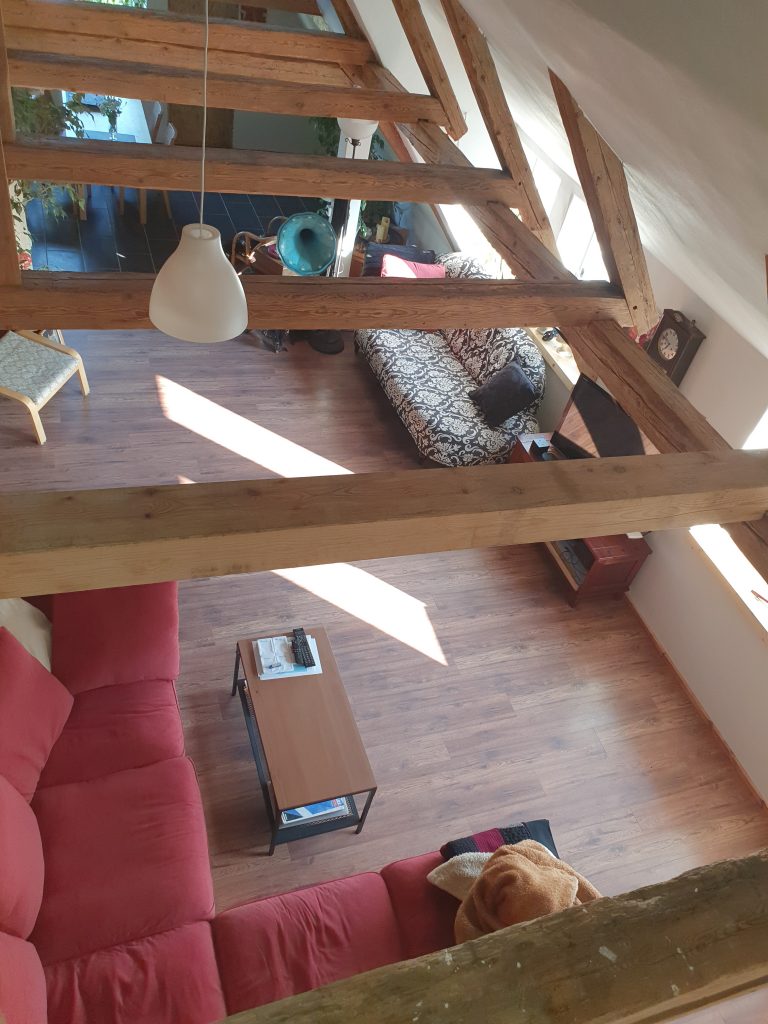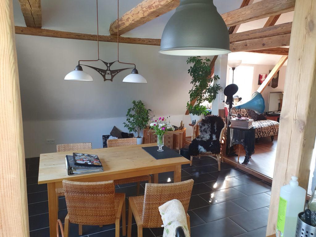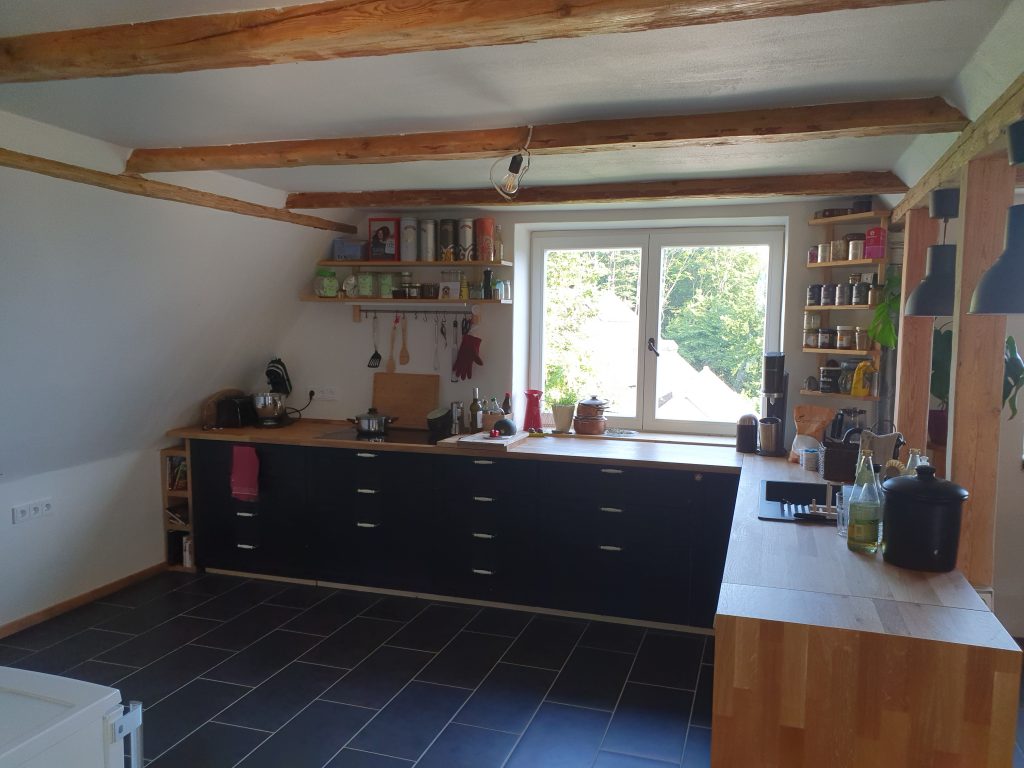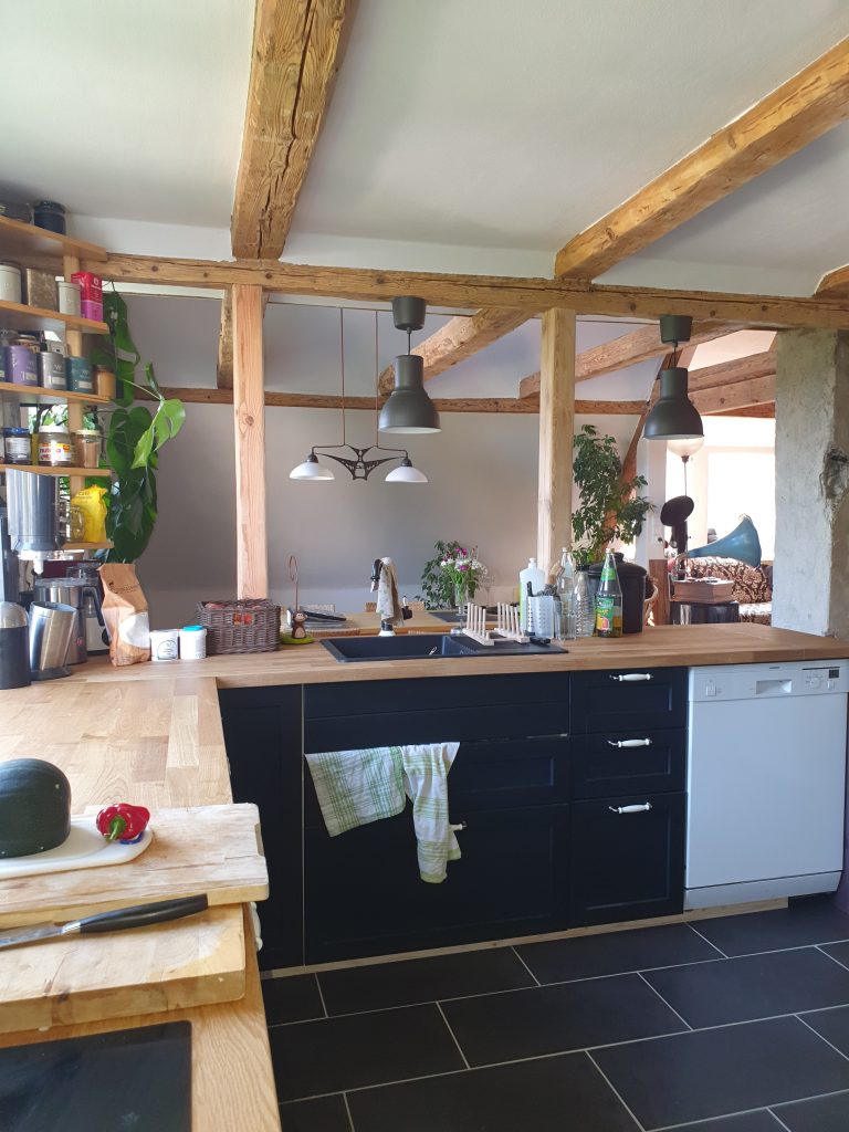 Zum Beispiel Küche: Chris hat die Arbeitsplatten verlegt, die Randleisten zugeschnitten und ich habe silikoniert. Wir haben unsere alten Regale aufgehängt und neue Lampen ausgesucht. Und so haben wir jetzt die Küche, die wir uns gewünscht haben: jede Menge Platz, damit wir uns nicht mehr über den Haufen rennen. Viel Arbeitsfläche, so dass man mal Sachen stehen lassen kann. Und Stauraum für alles und nichts. Aber wir sind noch nicht fertig! Wir haben immernoch Ideen! An die Seite des Kniestocks werden wir eine Bank bauen. Denn wie oft kocht einer in der Küche und der andere hat was zu erzählen? Bei uns dauernd.