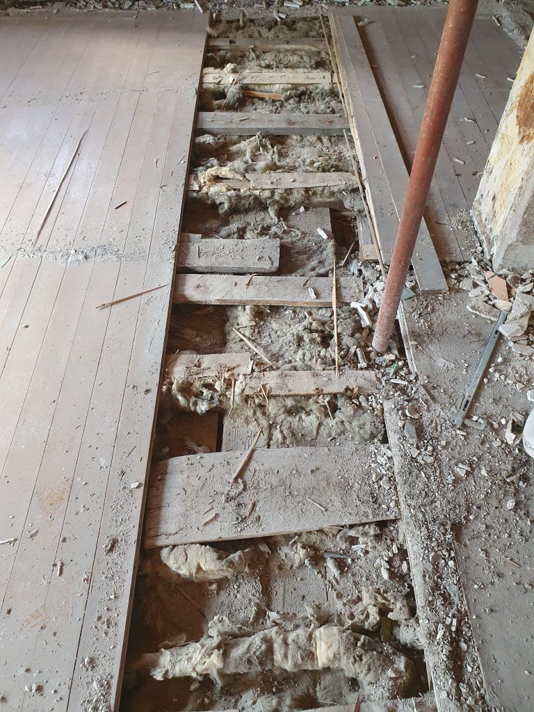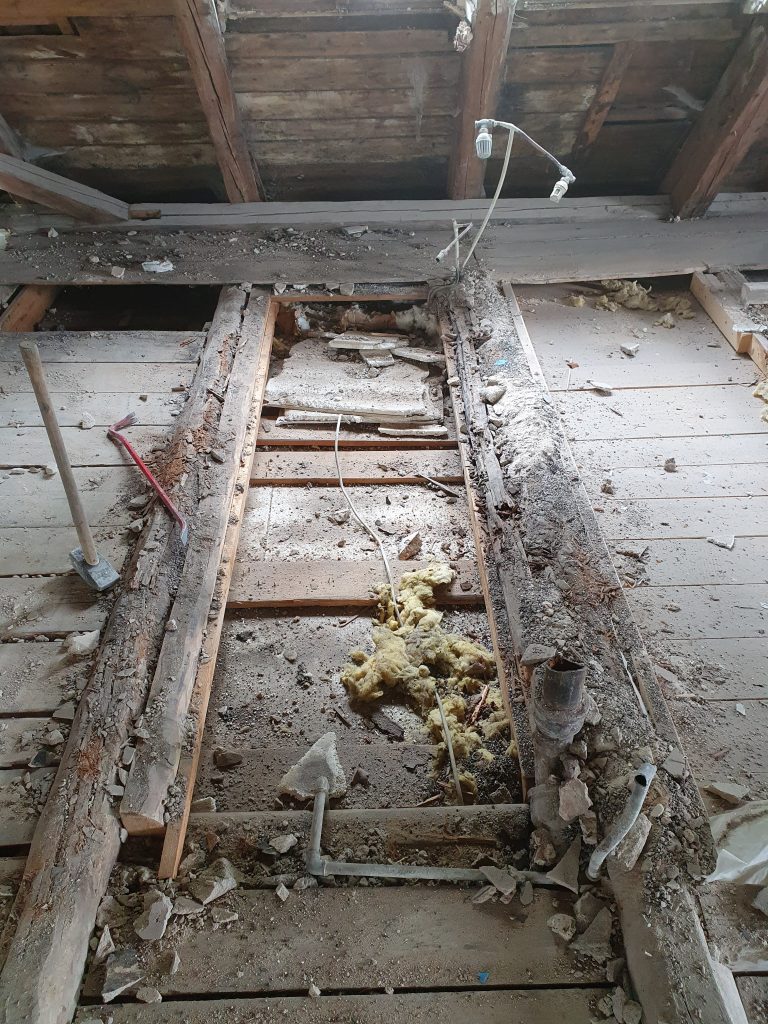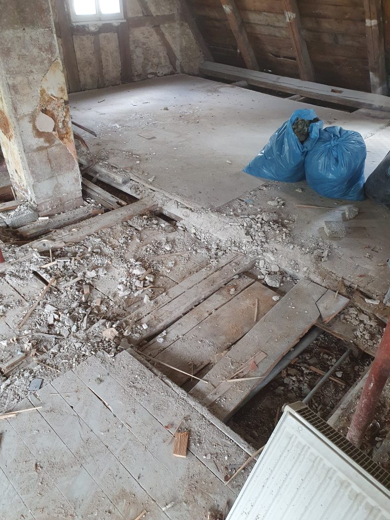 Wir müssen die Fußböden im gesamten 2. Stock bis auf die Fehlböden zurück bauen um eventuelle Schäden zu finden, das Geschoss für den neuen Boden vorbereiten und das ganze ekelige Zeug (Kot, Pipi, verfaulte Dinge…) aus dem Haus bekommen.