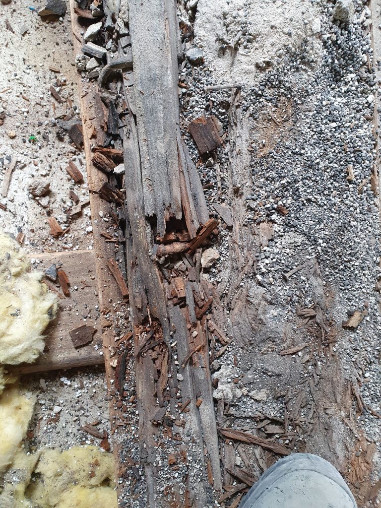 Glücklicherweise ist das nächste Gefach schon wieder in besserem Zustand, wenn auch etwas seltsam da es fast 20 Zentimeter höher liegt als der Rest. Es gibt sogar einen kompletten Unterbau. Immer mal wieder was neues! Was gleich bleibt ist der Dreck und die wirklich widerliche alte Dämmung um die sich wie immer heldenhaft Bine kümmert.