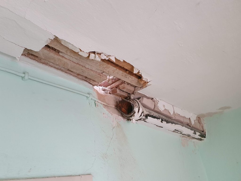 Leider bestätigen sich die oberflächlichen Eindrücke. Undichte Leitungen und nicht fachgerecht gelegte Rohre und Abdichtungen haben über die Jahre die Balken und Schalungen aus Holz vollkommen verrotten lassen. Als ich anfange die Rohre zu entfernen kracht im Stockwerk drunter die halbe Decke raus. Hier wird sicherlich ein Zimmermann entscheiden müssen was und wie man ersetzt.