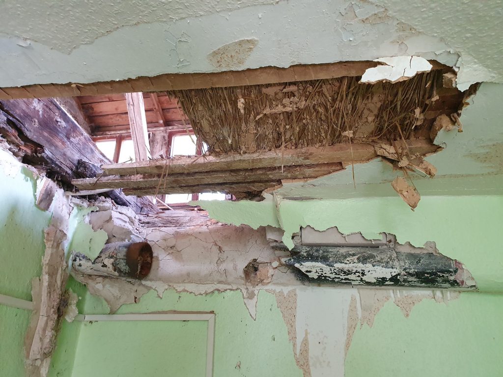 Wie auf dem Bild oben zu sehen ist liegt auf dem Boden des Spitzbodens / der Decke des dritten Geschosses sehr viel Dreck… Staub der Jahrhunderte und Dinge von denen ich lieber nichts wissen will. Der erste Versuch die Decke von unten einzureissen endet dann auch direkt darin das ich mit Sche%!&= übersät unter einem Faustgroßen Loch stehe und mein aufkeimendes Asthma gerade das kleinste Problem ist.