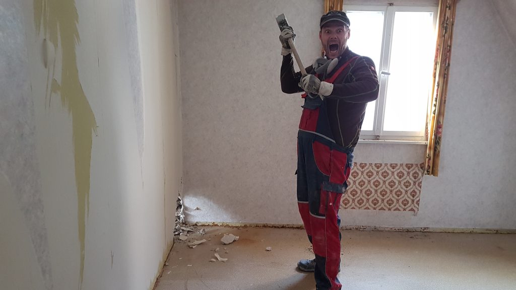 Am Sonntag haben wir uns dann dran gemacht, den Baumischschutt zu vermehren: wir haben die Decke im zweiten Stock runtergeholt. Und uns mit Glas- und Steinwolle rumgeschlagen… als Gott das fiese Juckzeug des Todes erfunden hat, hatte er einen ganz miesen Tag! Einmal Brille abgesetzt und man hat das Gefühl, man könnte sich die Augen rauskratzen…