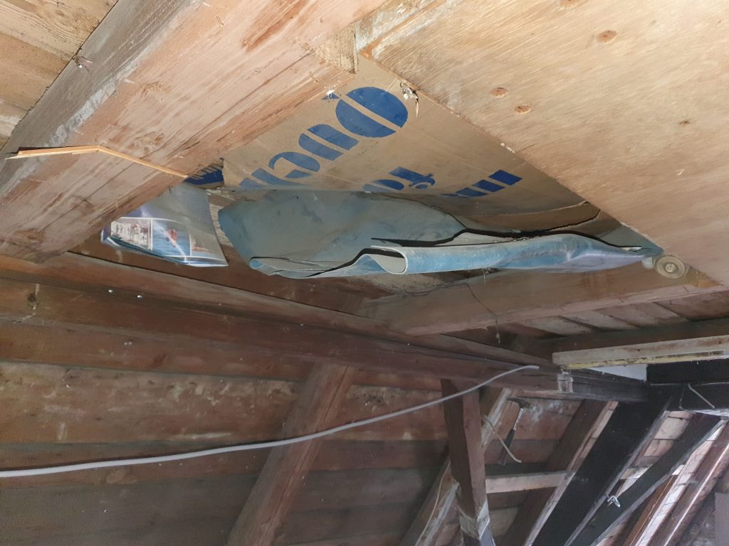 Und zwei nicht so schöne Funde: an der Nordwestseite war die Dämmung nicht fachgerecht und ein Balken und mehrere Bretter sind morsch. Ausserdem ist die Decke zum Spitzboden quasi nur Fassade… zum Glück ist da niemand draufgelatscht!
